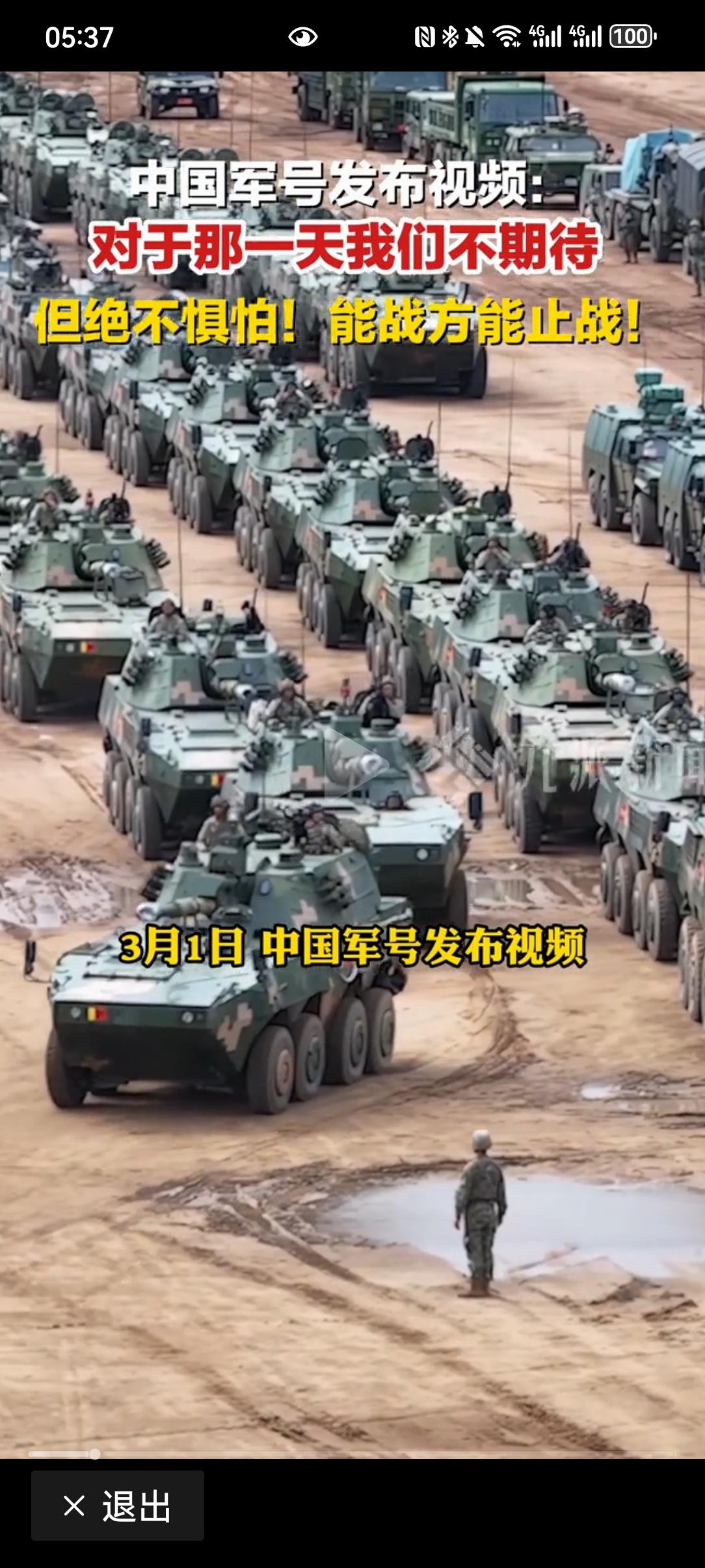 中国军号重磅发声:不期待那一天,但绝不惧怕! 我发现,当国际局势波谲云诡,总有一些声音试图挑衅我们的底线。 而就在3月1日,中国军号发布的一段视频,用最直接的方式给出了答案:对于那一天我们不期待,但绝不惧怕!能战方能止战! 不期待,是对和平最深的珍视 我们这代人,见证了国家从积贫积弱到繁荣富强的全过程。深知和平不是天上掉下来的,而是无数先辈用鲜血和汗水换来的。 “不期待那一天”,这句话背后,是中国对战争代价的清醒认知。 我们见过战火纷飞的惨状,也深知发展机遇来之不易。所以,我们始终坚持走和平发展道路,用对话代替对抗,用合作化解分歧。这不是软弱,而是一个大国对世界、对人民的责任担当。 绝不惧怕,是对底线最硬的捍卫 和平从来不是靠妥协换来的,而是靠实力守护的。 视频中,一列列轮式装甲车整齐列阵,官兵们眼神坚毅,这就是我们的底气。 从抗美援朝的冰天雪地,到如今的现代化强军征程,中国军队用一次次胜利证明:我们有能力捍卫国家主权、安全和发展利益。任何试图触碰我们底线的行为,都将遭到坚决回击。 “绝不惧怕”,这四个字,是对所有挑衅者最明确的警告:中国的领土一寸也不能少,中国的尊严一点也不能丢。 能战方能止战,是对未来最稳的承诺 “能战方能止战”,这是中国国防政策的核心逻辑。 我们发展国防力量,不是为了侵略扩张,而是为了“以武止戈”。 只有当我们拥有足够强大的实力,才能让那些不怀好意的势力望而却步,才能真正守护住来之不易的和平环境。这既是对国家的承诺,也是对世界的贡献——一个稳定、强大的中国,本身就是世界和平的重要基石。 “朋友来了有好酒,豺狼来了有猎枪。” 我们始终张开双臂拥抱和平,但也时刻准备着,用最坚定的力量守护家园。 你觉得,面对外部挑衅,我们最应该保持的心态是什么?欢迎在评论区留下你的看法。 (内容取材网络,观点仅供参考) 点亮〔收藏和赞〕你我共同成长