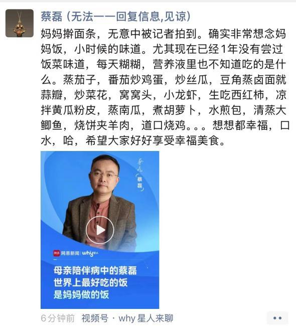 渐冻症终末期! 蔡磊朋友圈看哭万人:能好好吃饭,原来已是顶级幸福。 蔡磊已进入渐冻症终末期,全身瘫痪、完全失语,仅靠眼控仪交流。他在朋友圈转发母亲擀面条的视频,坦言整整1年没尝过饭菜味道,每日仅靠流食、营养液维持,喝水流速需严格控制在每秒1毫升,稍快便有窒息风险。他曾是京东副总裁,抗冻7年投入超8000万推动科研,帮1.8万病友寻找希望。 如今连一口家常菜都成奢望,他列出一串菜名感慨“想想都幸福”。生命倒计时里,他拼尽全力救他人,却连正常吃饭都做不到,看哭无数网友。