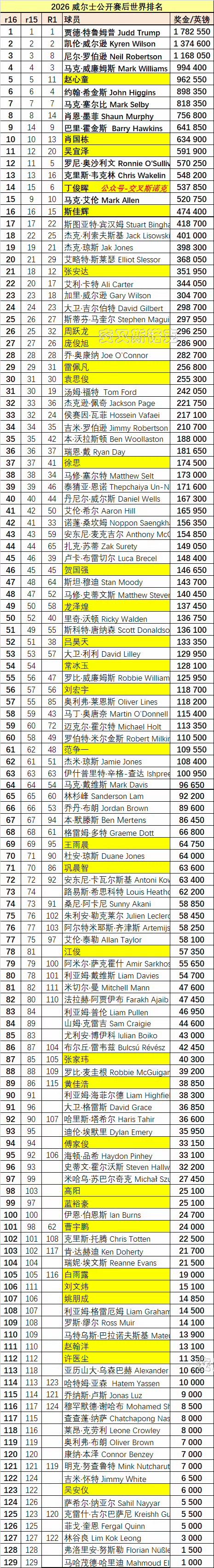 谁能想到霍金斯竟然送了丁主任一个天大的福气!霍金斯夺冠排名升至第9,丁俊晖排名不降反升。 扣除2024年球员锦标赛奖金,丁俊晖排名升至第14,但惊喜只是一瞬间,丁俊晖后面将扣掉2024年世界公开赛73000英镑的亚军奖金,排名将再次下滑。 丁主任能否直通克鲁斯堡,一切得等玉山公开赛、巡回锦标赛结果。