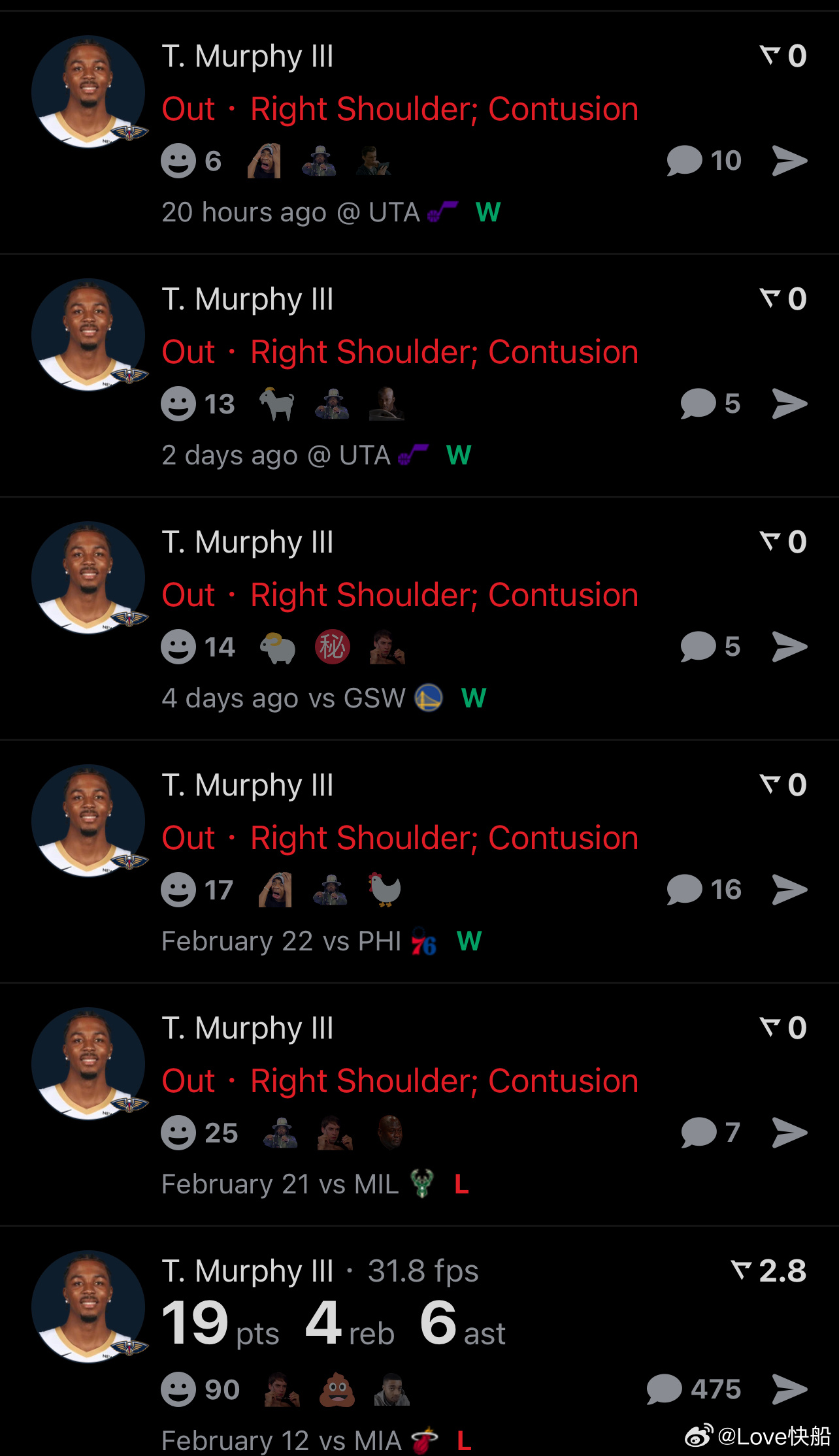 特雷墨菲自全明星以来还没出战过,他已经连续缺阵5场,所以他昨天也没打背靠背,今天他将迎来复出!