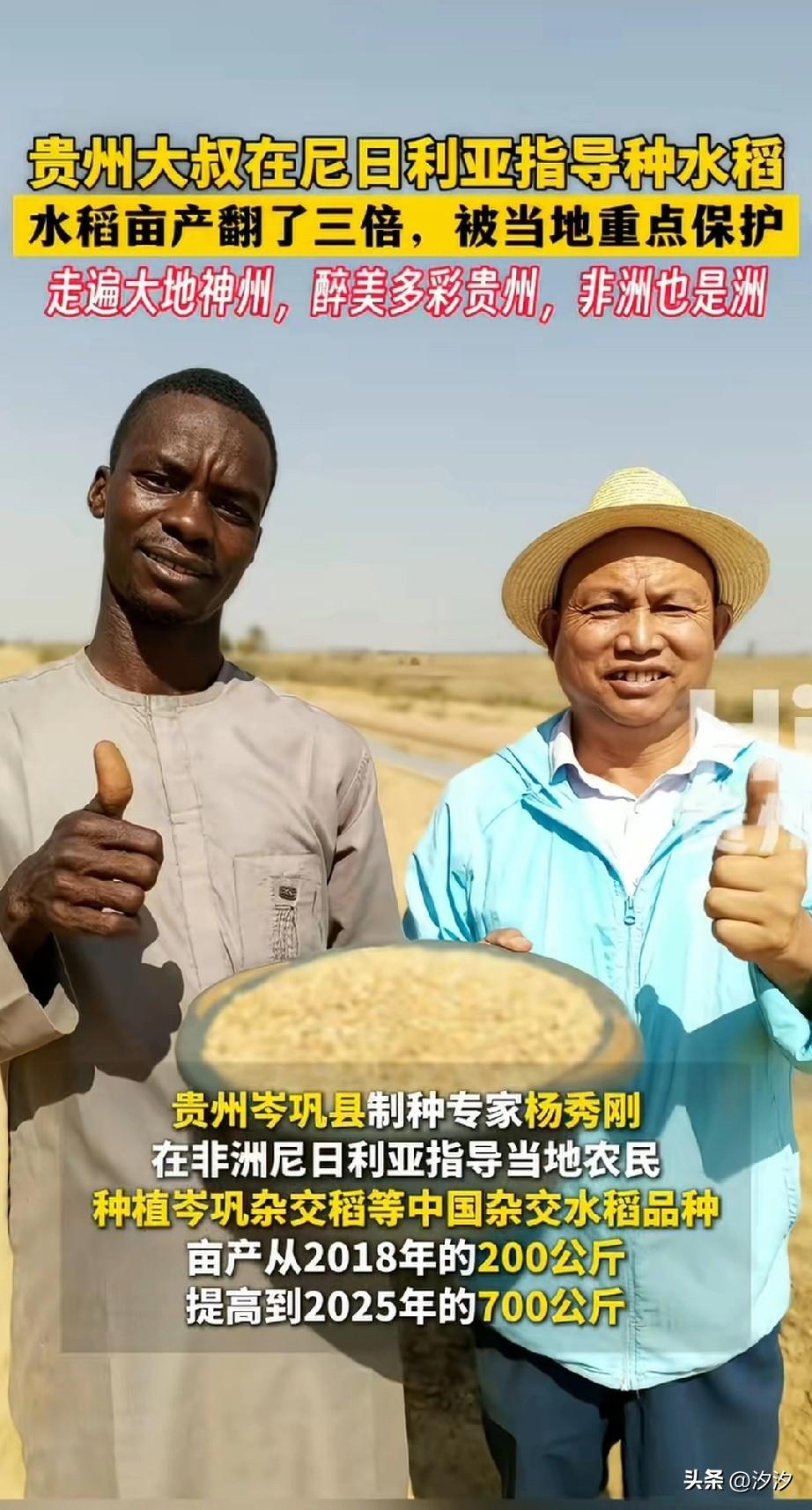 贵州大叔在尼日利亚指导种水稻, 将非洲的水稻亩产提高了三倍, 当地人拿枪守护他, 把他当做了专家, 本来只是制种专家的杨秀刚, 瞬间成了当地的著名人物, 在非洲他觉得非常的安全, 因为很多人都在保护他, 对于这样的特殊待遇, 他表示非洲很多人吃不饱饭, 他只希望自己的努力能让他们吃上饭, 他在那里传授了水稻种植技术, 还教他们如何打谷子, 可以说把技术毫无保留的传授, 他说贵州很美,是自己的家乡, 但是非洲也是洲, 自己也想不到在当地会被当成专家, 大家对于贵州大叔的壮举怎么看?
