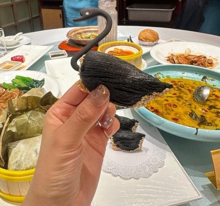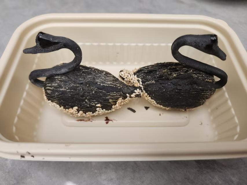 黑天鹅小吃你知道怎么做的吗? 昨天下饭店要选了一个奇特的小吃,名叫“黑天鹅榴莲酥”。 经过询问老师傅,得知外面的黑色是能食用的墨鱼汁作为酥皮,用食用色素点缀的“鹅冠”,里也是榴莲肉,外面底部用芝麻点缀,增加香气和视觉的层次感。 30元买两只,价格还算可以,榴莲实际价格也不低。 这个“黑天鹅榴莲酥”的装饰是不是很漂亮呢?请友友们评论一下吧!