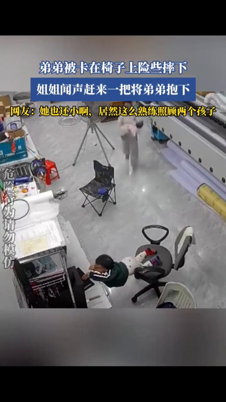 弟弟被卡在椅子上险些摔下,姐姐闻声赶来一把将弟弟抱下。 网友:她也还小,居然这么熟练照顾两个孩子。 2月28日广东。一把抱下,替弟弟出气。