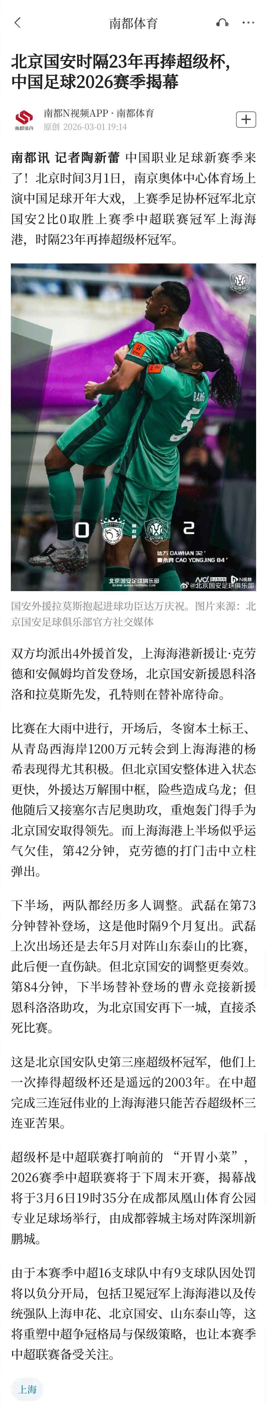 【#北京国安时隔23年再捧超级杯#,中国足球2026赛季揭幕】#中超联赛2026赛季周末开赛#中国职业足球新赛季来了!北京时间3月1日,南京奥体中心体育场上演中国足球开年大戏,上赛季足协杯冠军北京国安2比0取胜上赛季中超联赛冠军上海海港,时隔23年再捧超级杯冠军。