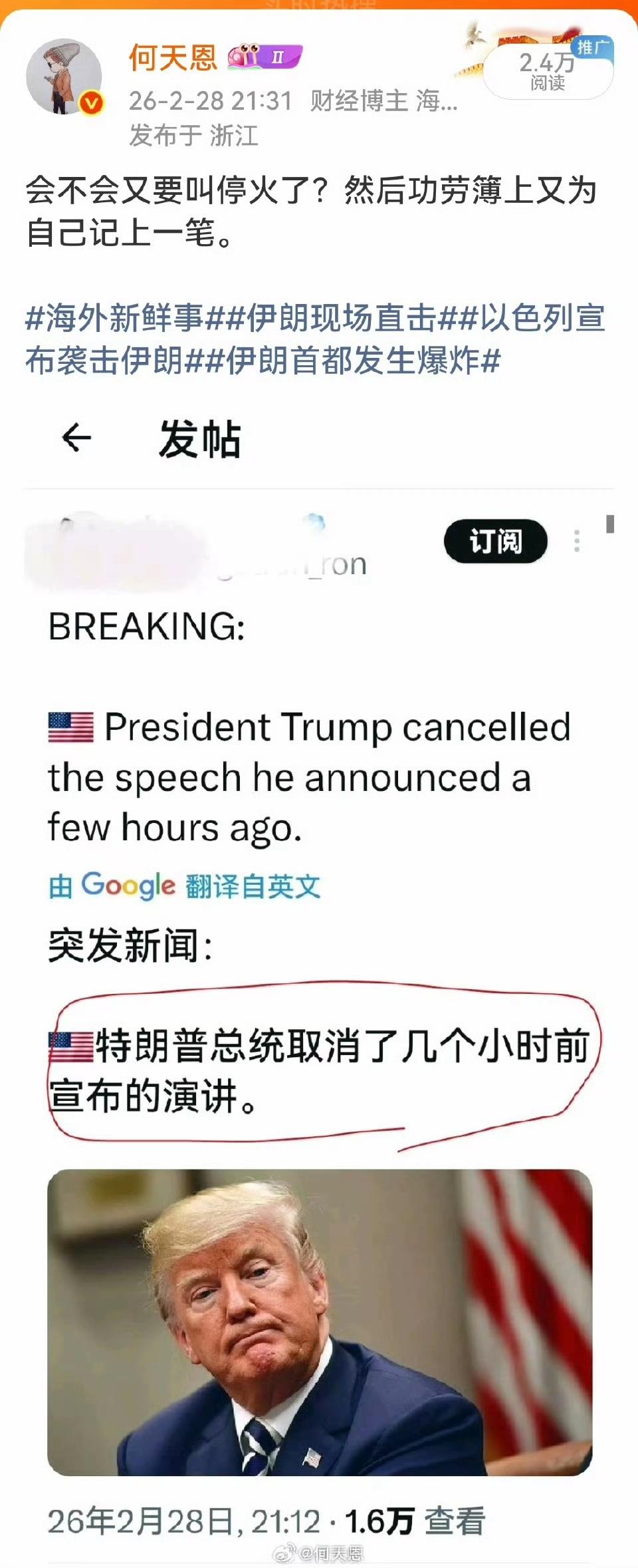 川川本来想干一票就跑,然后满世界嚷嚷赢了,这是川川最擅长的事情。哪知道这次剧本没有按照川川的设想走,且越来越远离川川的剧本,所以现在川川有点慌。一是国内53%的人反对对伊朗动武,二是民主党已经要求国会审查动武的程序合法性。这两个问题对川川来说都是小问题,最大的问题是自身和家人的人身安全问题,已经有组织扬言要对巴伦动手,那可是川川最心肝宝贝的巴伦呀。所以川川决定这几天躲在海湖庄园不出门,和家人在一起,并取消外事活动,比如取消原计划3月2日的演讲活动。本来计划在演讲会上大书特书自己在伊朗取得的丰功伟绩,这哈不敢吹了,那就躲家里吧。