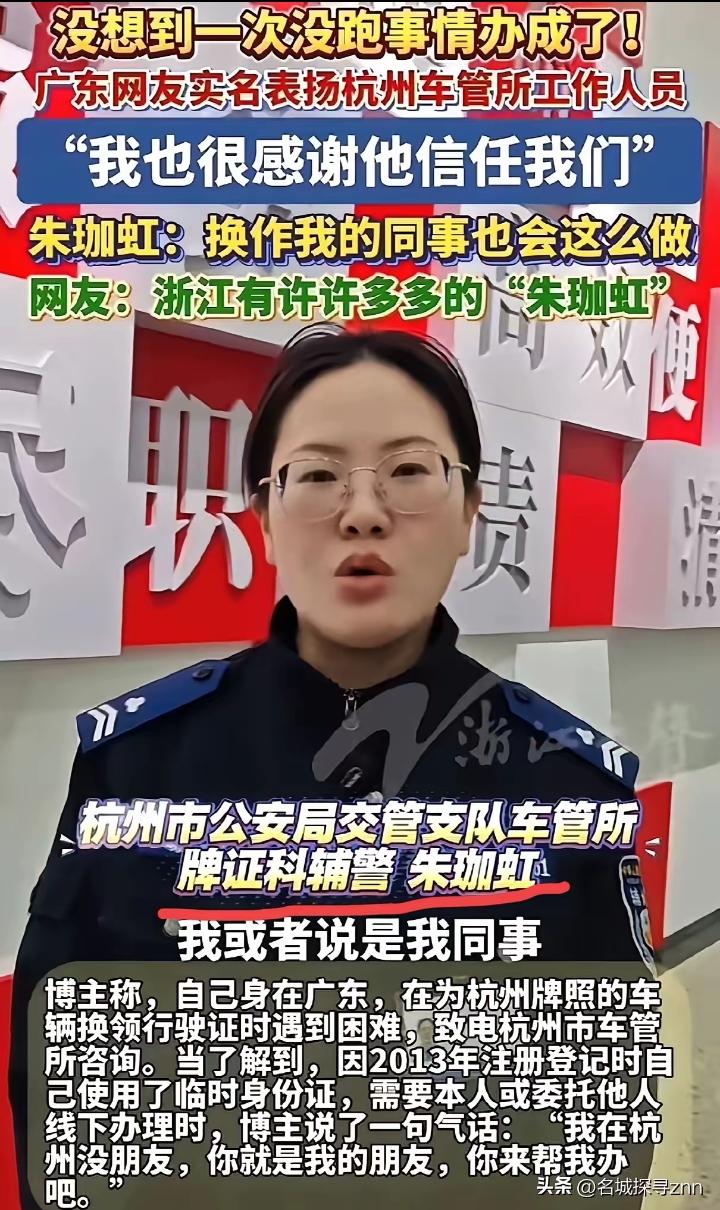 “浙江又火了!” 男子在广东行驶证需要换证,被杭州车管所的工作人员要求本人或者朋友代办!男子觉得被刁难,一气之下对工作人员说“我在杭州没朋友,要不你帮我办”,工作人员的做法让他惊呆了! 这名男子姓谢,十多年前在杭州买了一辆车,上了杭州牌照,后来去了广东发展,车子也一直没在杭州。 谢先生当时也就是随口那么一说,带着点情绪,没想到电话那头的女工作人员朱珈虹当真了,直接回复他说“如果你信任我,可以委托我帮你办” 。谢先生也是抱着试试看的心态,年后开工第一天就把身份证、车辆登记证这些重要材料快递寄到了杭州车管所 。让他没想到的是,材料寄到的第二天,朱珈虹就通过微信和他对接,从开始办到全部搞定,只花了68分钟 。这速度,比自己跑一趟车管所排队都快多了。 后来谢先生才知道,朱珈虹当时根本没把他那句气话当情绪看,而是满脑子想着怎么把这事儿办成 。为了远程帮他把证换了,朱珈虹不光自己上手,还拉上了档案岗、受理岗的五六个同事一起帮忙 。这其实就是杭州这些年在推的“把方便让给群众,把困难留给自己”的服务理念 。而且杭州车管所从2023年开始就一直在搞数字化改革,像谢先生这种特殊情况,放以前肯定得本人跑一趟,现在通过内部协调就能远程搞定 。 其实这事儿能成,还有个关键背景。杭州在政务服务这块一直走在全国前面,2025年7月还作为全国新车上牌“一件事”改革的唯一省会试点,打通了12个部门的数据壁垒 。正是因为平时就有这种跨部门协作的底子,遇到谢先生这种个例,工作人员才能灵活处理,而不是一句“规定就是规定”给怼回去。谢先生在广东,通过手机委托、人脸识别授权,杭州这边后台核实完信息,直接就把新证办好寄给他了 。 事情办完后,谢先生特意发了条视频感谢朱珈虹,说虽然远隔千里,但能感受到她一点不怕麻烦,一直在主动想办法 。朱珈虹倒觉得这没啥,换所里任何一个同事都会这么干 。不过这事在网上传开后,很多浙江本地网友都出来说话,有的说自己办公积金也是这效率,有的说在杭州办事从来只有效率、没有刁难 。看来,“朱珈虹”在浙江还真不是个例。 这事说到底,不是什么高科技,也不是什么大政策,就是一个人愿意帮另一个人。谢先生在杭州没朋友,工作人员说“我就是你朋友”,然后真把朋友该办的事给办了 。咱们平时办事最怕什么?就怕工作人员板着脸说“不行”。朱珈虹这做法其实挺简单的,就是换个思路,把“按规定不能办”变成“想想怎么能办”。杭州这些年的营商环境口碑好,真不是靠喊口号喊出来的,就是靠朱珈虹这样一个个具体的办事员,把来办事的人当回事,把小事办利索了 。当然也得说,谢先生敢把身份证这种重要证件寄给一个陌生人,这份信任也值得点个赞。