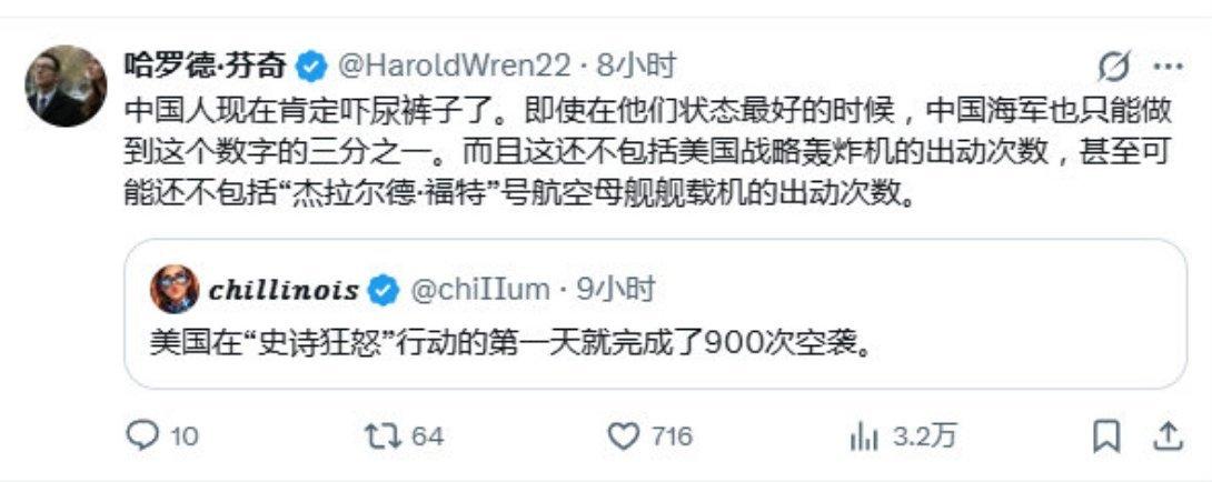 外国网友: “中国人现在肯定吓尿裤子了!” 美国在"史诗狂怒"行动的第一天就完成了900次空袭。 有外国网友就说,中国人现在肯定吓尿裤子了。 即使在他们状态最好的时候,中国海军也只能做到这个数字的三分之一。 而且这还不包括美国战略轰炸机的出动次数,甚至可能还不包括"杰拉尔德.福特"号航空母舰舰载机的出动次数。 这嘚瑟玩意儿知不知道,他们国家以前有个叫麦克阿瑟的老家伙,在朝鲜战场上老嘚瑟了,结果呢?嘚瑟着圣诞节都回不了家。 只能说,人真的无法想到他认知之外的事情。