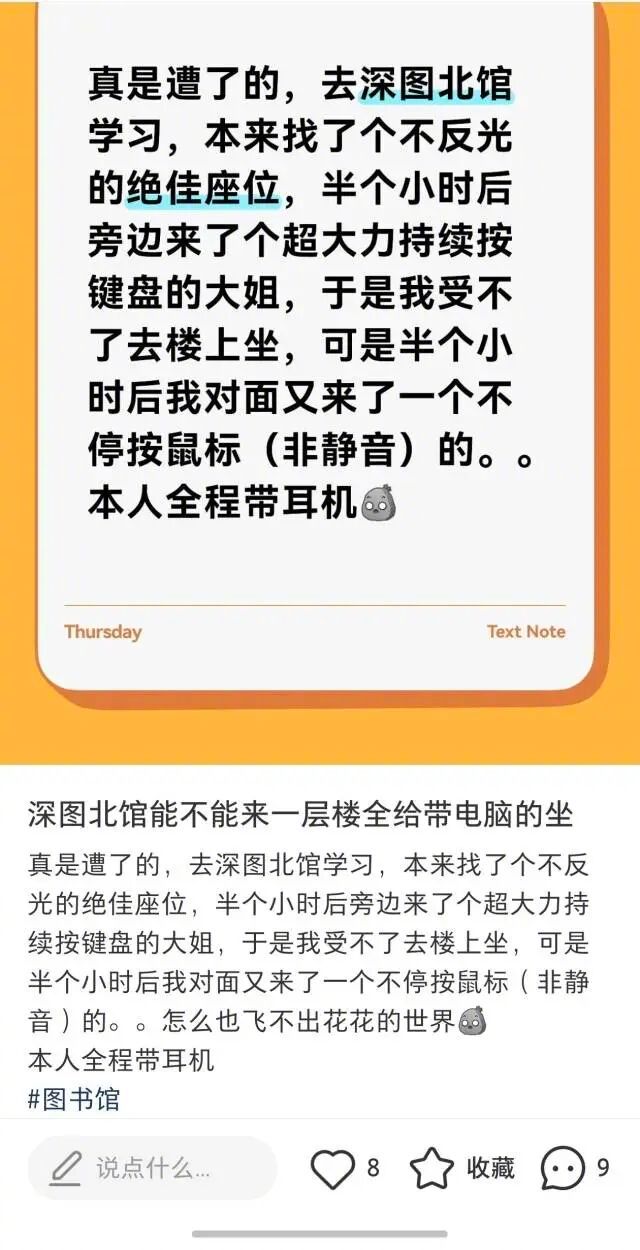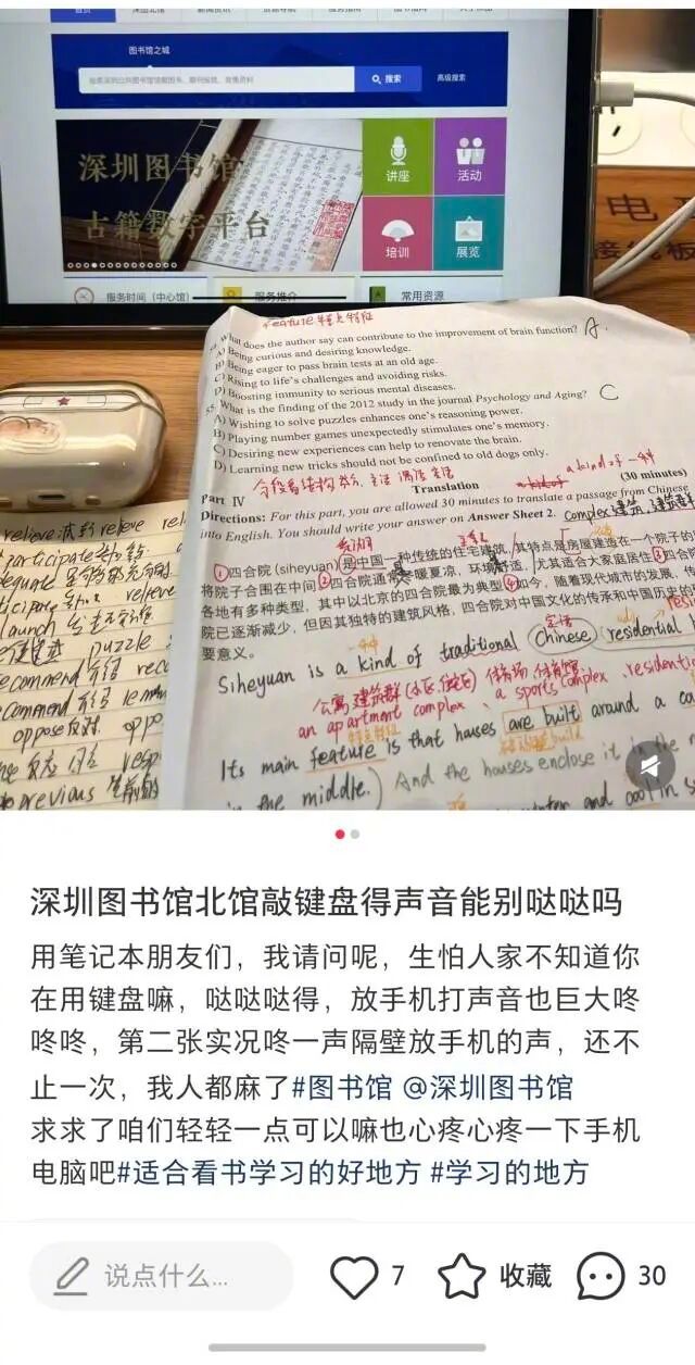 #图书馆键盘声太吵换个座位还是吵#【“敲键盘声真的巨大!”网友吐槽深图北馆噪音扰人,回应来了】#深圳图书馆回应键盘声太吵##图书馆该不该禁用机械键盘#近日,有深圳市民通过人民网领导留言板反映,深圳市图书馆北馆在噪音管理方面存在不足,尤其对非静音键盘、鼠标等设备缺乏明确禁止标识,建议馆方参考南山书房荔香公园沉浸式阅读区模式,增设独立隔断的静音阅读空间。