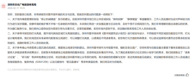 对此,深圳市文化广电旅游体育局回应称,目前以倡导自觉与现场引导为主要管理方式,暂未有搭建独立阅读隔间的整体规划。