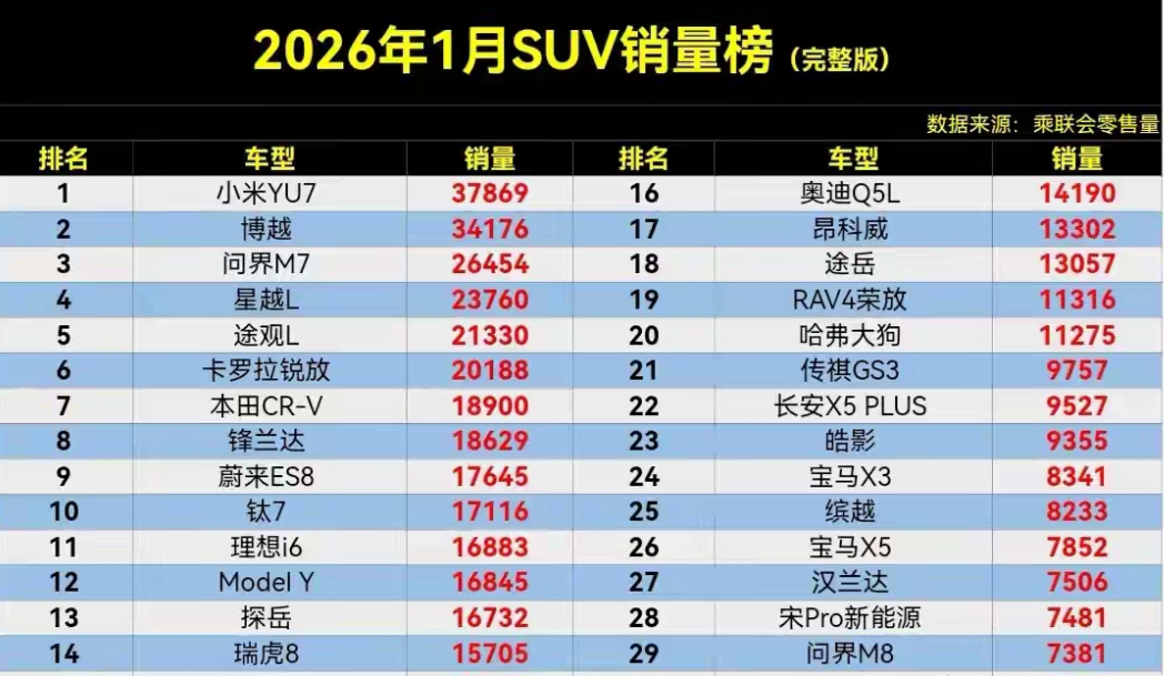 不得不说小米YU7厉害,一销量成功登顶榜首,小米汽车1月整体交付超3.9万台,YU7是绝对主力,小米YU7消量高达3.7万辆,小米为刺激消费,推出金融方案还赠送购车权益,春节门店也不打烊。2025年小米汽车就表现不俗,2026年目标55万辆,有YU7这势头,说不定真能实现。