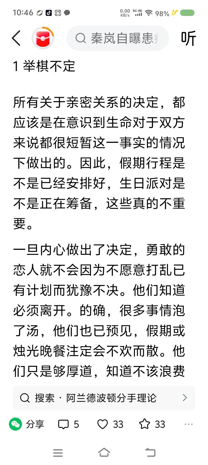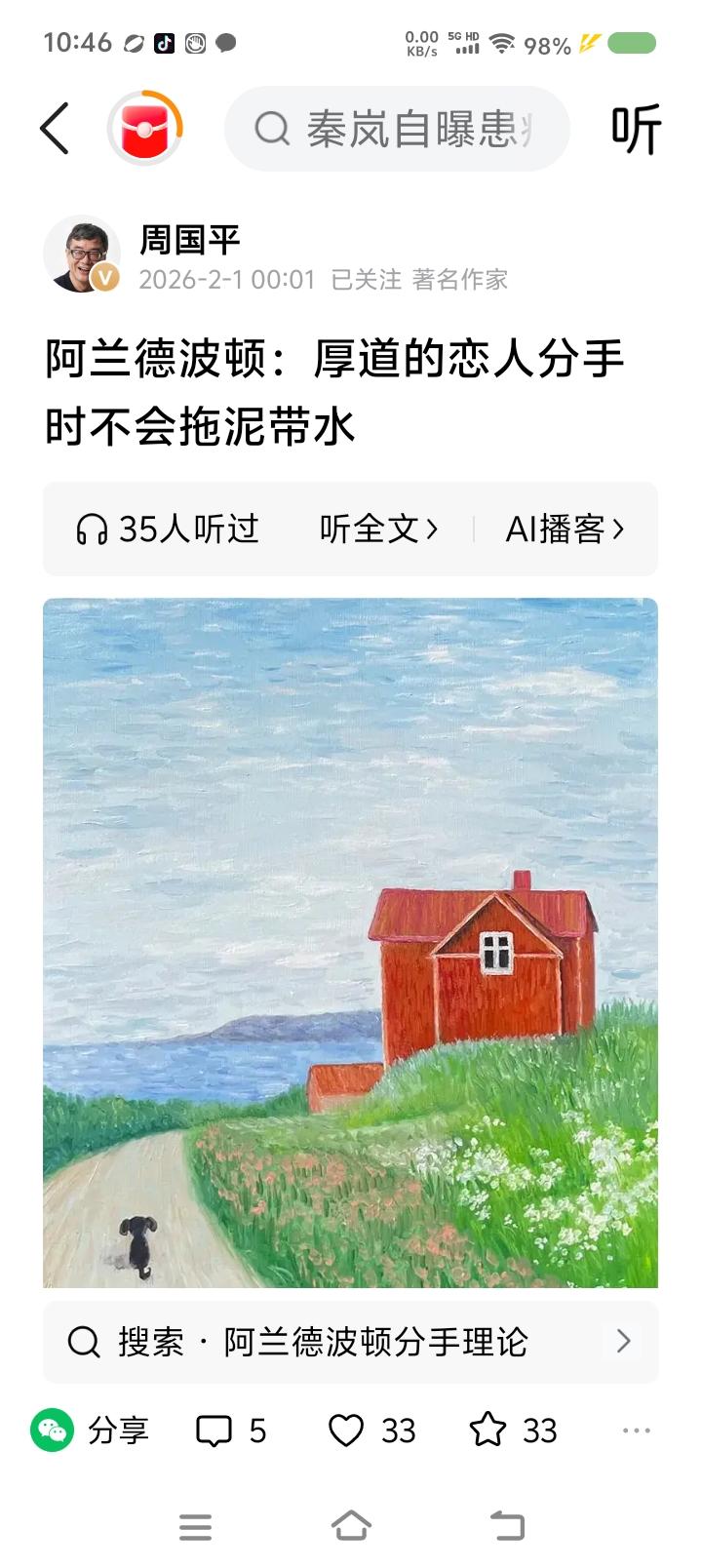 为什么某些电视剧让我讨厌—— 周国平引用的几段话,让我明白为什么讨厌一些电视剧了。过去,直觉上讨厌;现在,有了理论依据。为了简洁,我概括如下: “分手了也要友善是一种错误观念。持续不断的友善,让我们更加困惑,这种温柔让我们渴望复合,似乎复合水到渠成,甚至可能稀里糊涂地共赴云雨。” 某些电视剧一直在宣扬分手后离婚后与前任纠缠不清的情节。现实中当然有这种情形,复合复婚也是不少的案例。但这本质上会传达不切实际的规划,而且噩梦往往再次降临。 边界感,就是生命线。 和平分手,不纠缠,不指责,不破坏过去的美好,真诚地希望对方过得更好,处理好孩子的事,不要有财产纠纷,不要打扰对方,不要与对方的家人、朋友联系,彻底从对方的情感生活里消失,不要让自己产生从对方那里获得任何评价的期望——这就是我理解的理想的中国式分手。 最后补充一句,我没有分手经验。只是认为情理应如此。