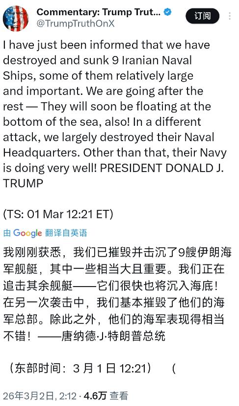 特朗普今天(北京时间3月2日)发文写道:“我刚刚获悉,我们已摧毁并击沉了9艘伊朗海军舰艇,其中一些相当大且重要。我们正在追击其余舰艇它们很快也将沉入海底!在另一次袭击中,我们基本摧毁了他们的海军总部。除此之外,他们的海军表现得相当不错!” 特朗普3月2日发文称美军已摧毁伊朗9艘舰艇并重创其海军总部,这事儿得掰扯清楚。美军中央司令部同步证实,在阿曼湾恰赫巴哈尔附近击沉一艘“贾马兰”级护卫舰,这船算伊朗海军里“有分量”的家伙。按特朗普说法,剩余舰艇正被追击,“很快也得沉底”。 更狠的是,美军自称“基本摧毁”伊朗海军总部,还顺带砸了革命卫队总部。B-2隐形轰炸机扔下2000磅炸弹,专门招呼加固的弹道导弹设施。五角大楼列了份“战果清单”:超1000个目标被炸,涵盖导弹阵地、指挥中心和工业设施。 伊朗这边没闲着。革命卫队放话“陆海都是侵略者坟场”,导弹直接招呼美军基地和以色列。德黑兰时间28日,美以联军刚动手,伊朗立马回击——美军在伊拉克的基地挨了无人机,阿联酋迪拜机场也遭导弹“问候”。伊朗外长阿拉格齐强调“自卫权不容置疑”,还点名美国“别发动攻击”。 伤亡数字有点扎眼。伊朗媒体报小学被炸死148人,美军3人死亡、5人重伤。特朗普倒挺得意,说行动“进展顺利甚至提前完成”,但话锋一转又提谈判——伊朗新领导层想谈,他“同意对话”,可具体时间“不便透露”。 这出戏里,美伊双方都在“边打边谈”。伊朗政府成立专家委员会保公共服务,国际原子能机构紧急开会,联合国秘书长喊“立即停火”。中国驻伊使馆提醒公民撤离,外交部则呼吁“停止军事行动”。 现在问题卡在三个坎儿:维也纳谈判要是崩了,以色列可能单方面动手;伊朗封锁霍尔木兹海峡,美军就得陷泥潭;导弹基地要是还能反击,双方都得掂量代价。特朗普想“以打促谈”,但伊朗态度硬气——阿拉格齐说“任何严肃努力都持开放态度”,可前提是“别先动手”。 说到底,这轮冲突不是简单的“击沉舰艇”能概括。美军双航母压境,F-22/F-35满天飞,可后勤撑不住持久战;伊朗导弹虽猛,但封锁海峡等于断自己财路。双方都在算账:美国怕深陷战争泥潭,伊朗怕政权不稳。 现在看,和平通道没堵死,但得看谁先让步。特朗普要的是“彻底摧毁伊朗威胁”,伊朗要的是“生存权”。这局棋,走错一步就是全面战争,可谁都不想当那个“掀桌人”。