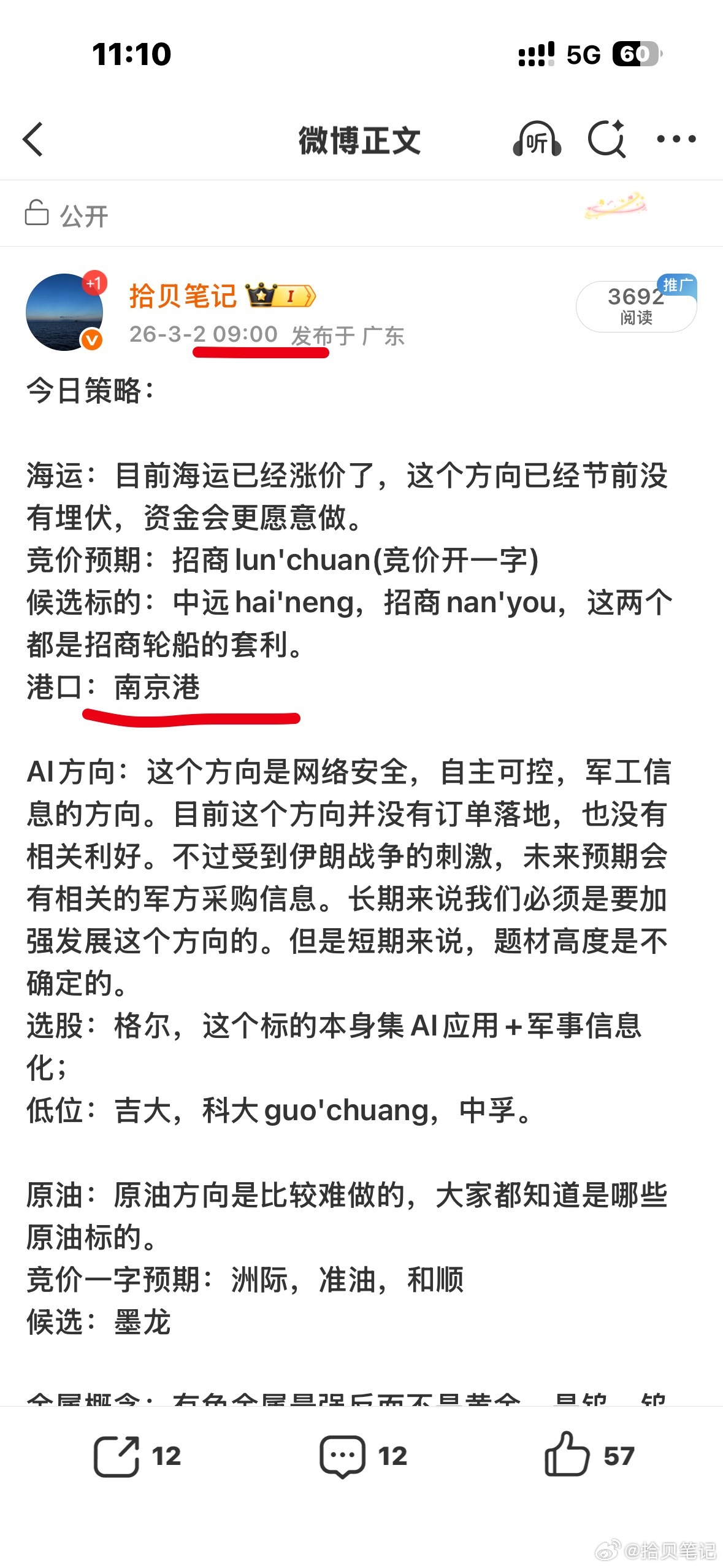 南京gang:认真看了早盘策略的粉丝,今天都吃到板了,这个是最安全的标得,板块竞价也开的比较稳妥,其他的要么进不去,要么不及预期。