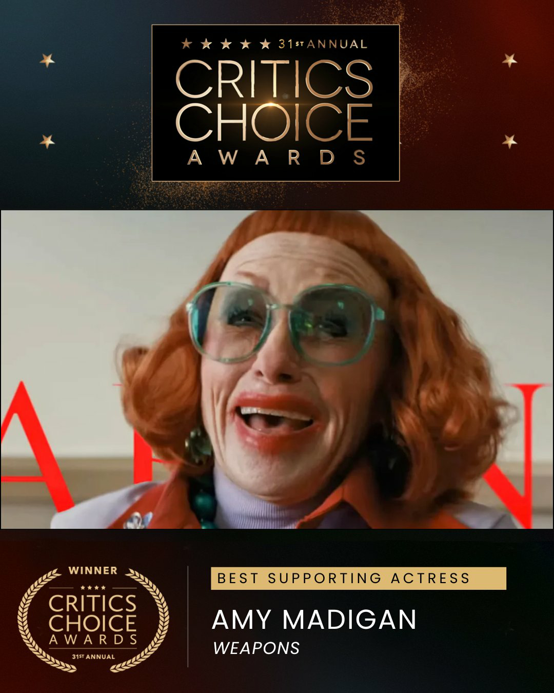 今年颁奖季最混战的奖项——最佳女配角!所以谁会笑到奥斯卡呢?!演员奖获奖名单 美国演员奖:Amy Madigan《凶器》BAFTA英国电影学院奖:乌米·马萨库《罪人》金球奖:Teyana Taylor《一战再战》评论家选择奖:Amy Madigan《凶器》