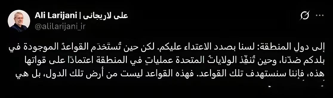拉尼贾尼的回应绝了,一点毛病都没有!针对海湾地区多个 国家的强烈抗议,伊朗最高国家安全委员会秘书阿里•拉尼贾尼发帖称:“向海湾地区国家表示:我们无意攻击你们。但当位于你们国家的基地被用来针对我们,当美国依靠这些力量在该地区开展行动时,我们将打击这些基地。因为这些基地不属于这些国家的领土,而是美国的领土。” 美以在2月28日对伊朗发动军事打击后,伊朗随即展开反击,打击了巴林、科威特、约旦、阿联酋、卡塔尔等国境内的美军基地,这一举动引发海湾国家的不安与抗议,担心自己被拖入战火,拉尼贾尼正是在这样的背景下,用阿拉伯语公开发声,安抚地区国家同时亮明伊朗的底线。 他一番发言把一场可能引发地区混战的冲突,瞬间切割成伊朗与美国之间的对抗,既给海湾国家吃了定心丸,避免周边国家倒向美国抱团施压,又牢牢占据道义高地,明确反击的对象只是滥用基地的美国,而非无辜的地区国家,把战争的边界划得清清楚楚,也让伊朗的报复行动显得有理有节,不是盲目扩大冲突。 美国在海湾地区的军事布局,确实是悬在伊朗头顶的一张网,也让周边国家处境尴尬。多年来,美国以维护地区安全为借口,在海湾国家密集部署军事基地,形成了围堵伊朗的前沿阵地,卡塔尔的乌代德空军基地是美军在中东最大的基地,驻扎上万人,还是中央司令部前沿指挥部。 巴林驻扎着美国海军第五舰队司令部,科威特、阿联酋、约旦也都有美军的核心军营和空军基地,这些基地配备先进战机、导弹系统和情报设施,平时用来监视威慑伊朗,一旦局势紧张就成了打击伊朗的前沿据点。 对海湾国家来说,允许美军驻扎有安全层面的考量,但也让自己的国土变成大国博弈的战场,一旦美伊对抗升级,这些基地首当其冲,本国安全也会被捆绑在美国的战略上,这也是此次伊朗反击后,多国纷纷表达担忧、希望避免局势失控的原因。 拉尼贾尼的表态,恰恰戳中了这个痛点,他没有指责海湾国家,而是把问题聚焦在美军基地的性质上,点出这些基地已经脱离所在国的实际管控,成为美国推行霸权的工具,既理解周边国家的处境,又坚定维护自身安全利益,这种分寸感让他的发言更有说服力。 伊朗的行动和拉尼贾尼的表态,也彻底打破了美军在中东基地“绝对安全”的幻觉。过去很长一段时间,美国凭借遍布中东的基地体系,对伊朗实施极限施压,认为伊朗不敢轻易触碰这些据点,即便发动打击也会顾虑周边国家的反应。 但这次伊朗用实际行动证明,只要基地被用来针对自己,就会成为合法打击目标,从巴林的第五舰队司令部到卡塔尔的乌代德基地,都遭到伊朗导弹袭击,美军所谓的后方安全区不复存在,整个中东的美军设施都处在伊朗的反击范围之内。 拉尼贾尼的发言,更是把这种军事反击上升到战略层面,告诉美国和地区国家,伊朗的反击有明确目标、有清晰边界,不会无差别攻击,只会针对威胁自身的美军力量,这既降低了冲突失控的风险,也让美国无法轻易拉拢地区国家组建反伊联盟,让美国陷入单打独斗的被动局面。 整件事看下来,拉尼贾尼的回应之所以被称赞,本质上是因为它精准拿捏了局势的关键,用最直白的语言划清冲突边界,用最坚定的态度维护国家利益,既不激化与邻国的矛盾,又不向美国的霸权低头。 在大国博弈激烈的中东,这样的表态不仅是外交上的高明操作,更是对自身安全底线的坚定捍卫,也让国际社会看清,美国在中东遍布基地的霸权做法,终究会让自己陷入处处受掣肘的境地,而地区国家的安全,终究不能依靠外来军事力量,只能通过对话协商实现。