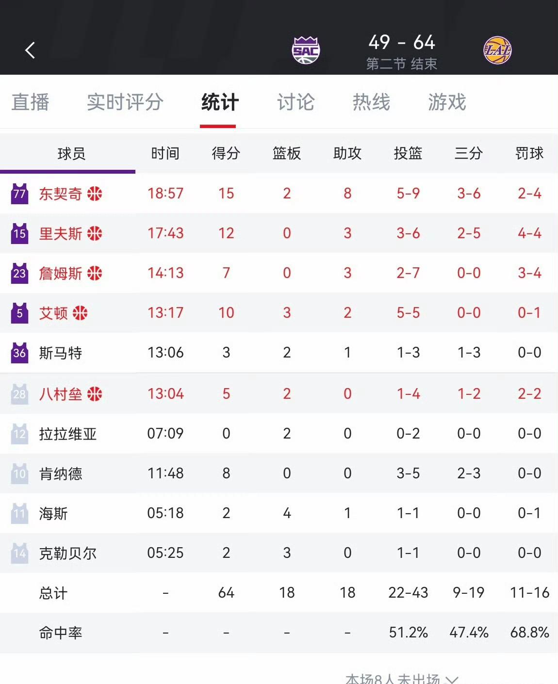 半场结束,湖人64-49领先国王15分,后面有些松懈。第三节会出现湖三崩吗? 詹姆斯的助攻数来到了湖人队史第五位,昨天三分数来到湖人队史第一。