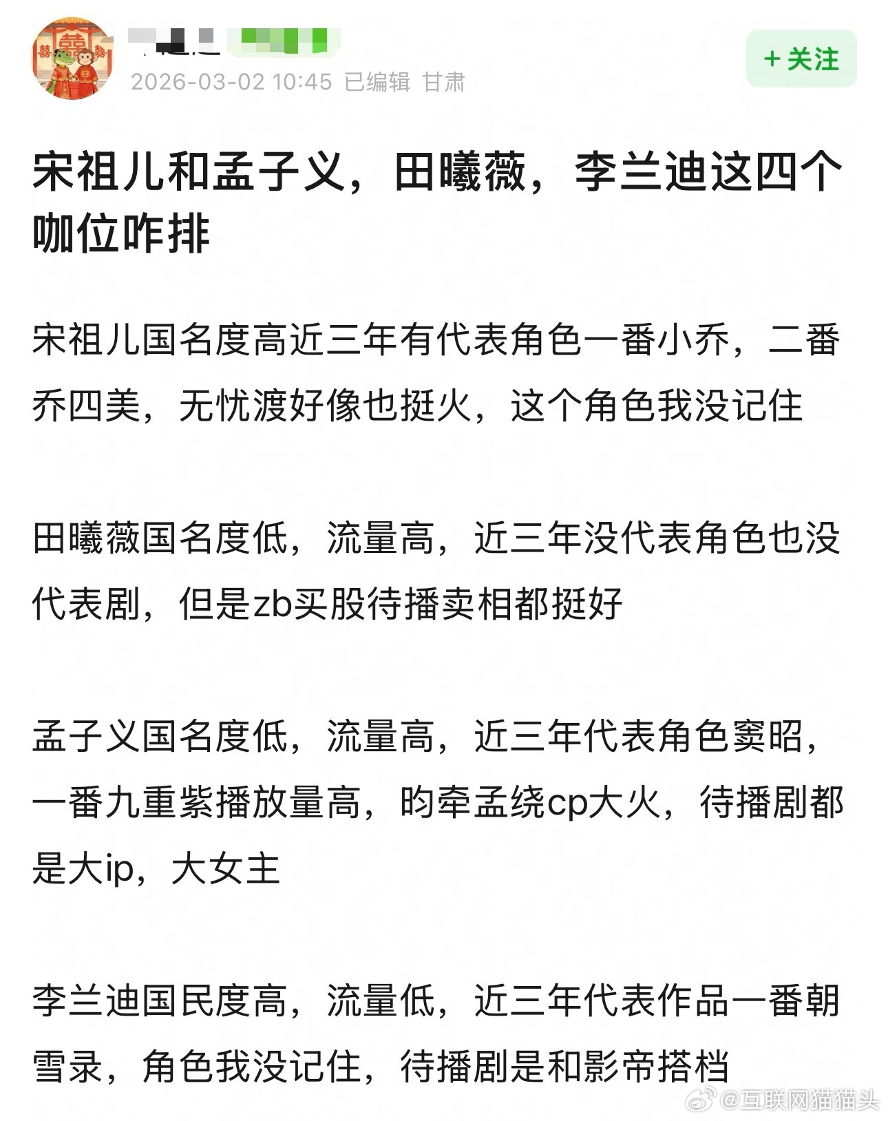 宋祖儿孟子义田曦薇李兰迪这四个咖位咋排微博之夜的座位安排已经很明显了