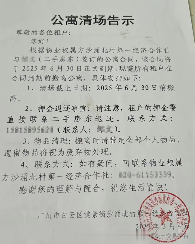 目前,该栋公寓楼权属方沙涌北村第一经济社合作社承诺让租户们免租居住两个月。后续,当地街道办将协调做好租户的安置工作,并协助租户维权。
