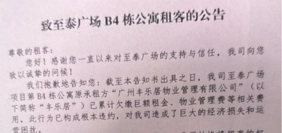 广州黄埔至泰广场的B4栋公寓,由广州至泰投资有限责任公司打包交给了广州丰乐居物业管理有限公司出租运营,租期20年。