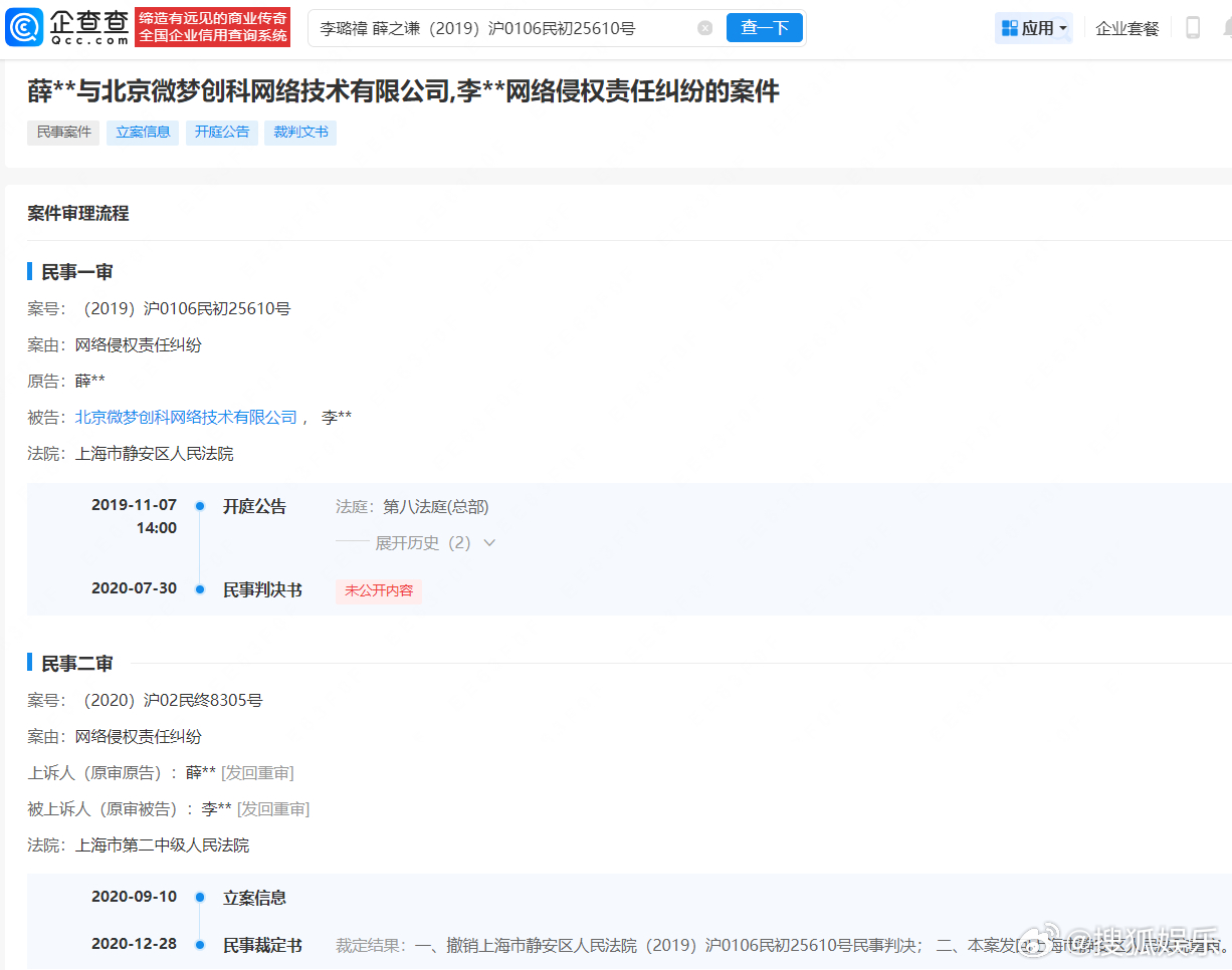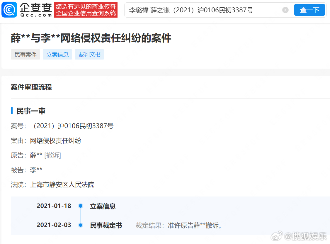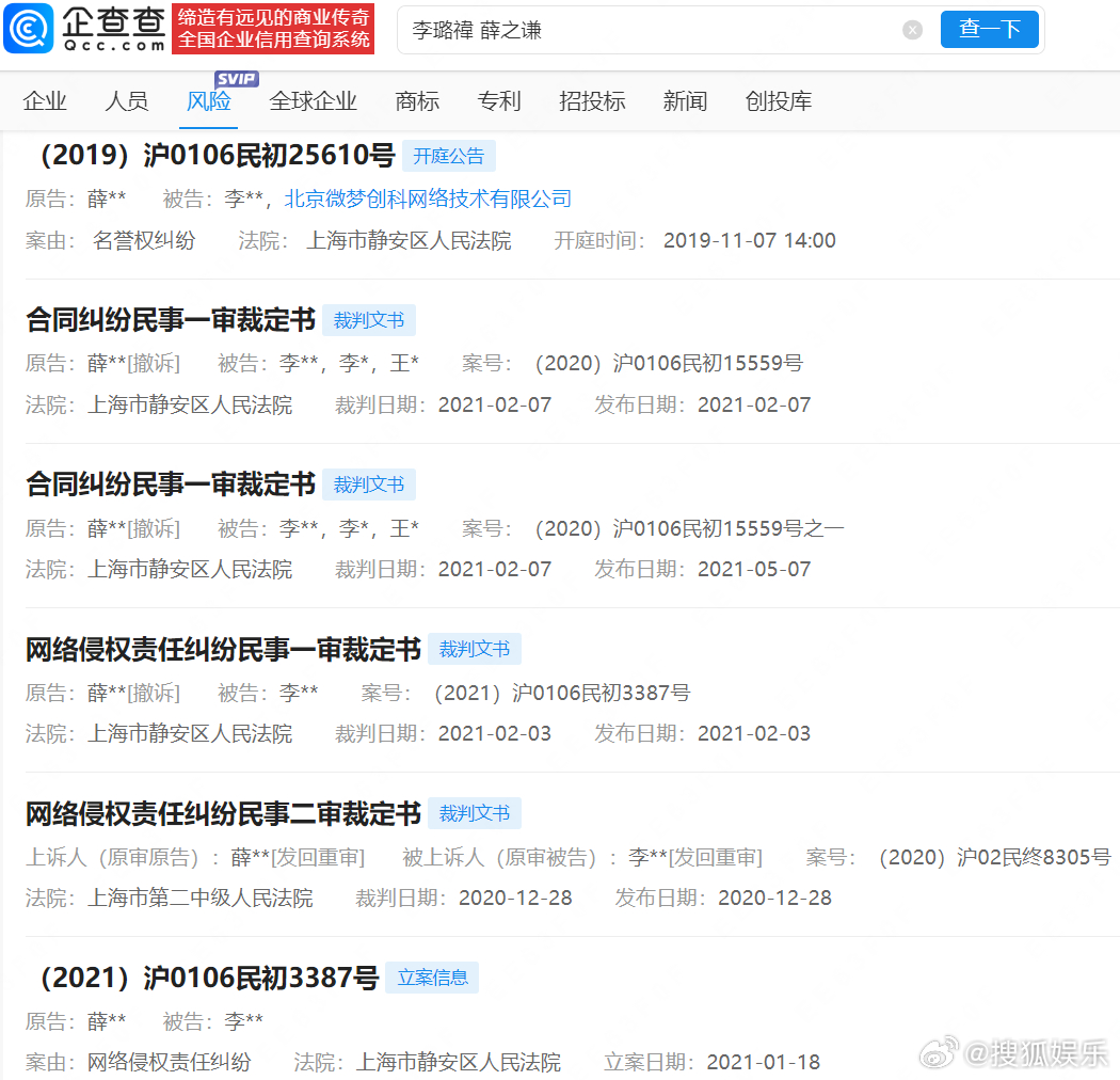 企查查APP显示,薛之谦曾多次起诉李雨桐(本名李璐禕)侵权,案由包括名誉权纠纷、合同纠纷等。2019年薛之谦以名誉权纠纷起诉李雨桐,2020年7月一审宣判后,薛之谦提起上诉,二审撤销原判;2020年薛之谦因合同纠纷起诉李雨桐,2021年法院准许其撤诉;2021年1月,薛之谦又因网络侵权责任纠纷起诉李雨桐,后再次申请撤诉并获法院准许。