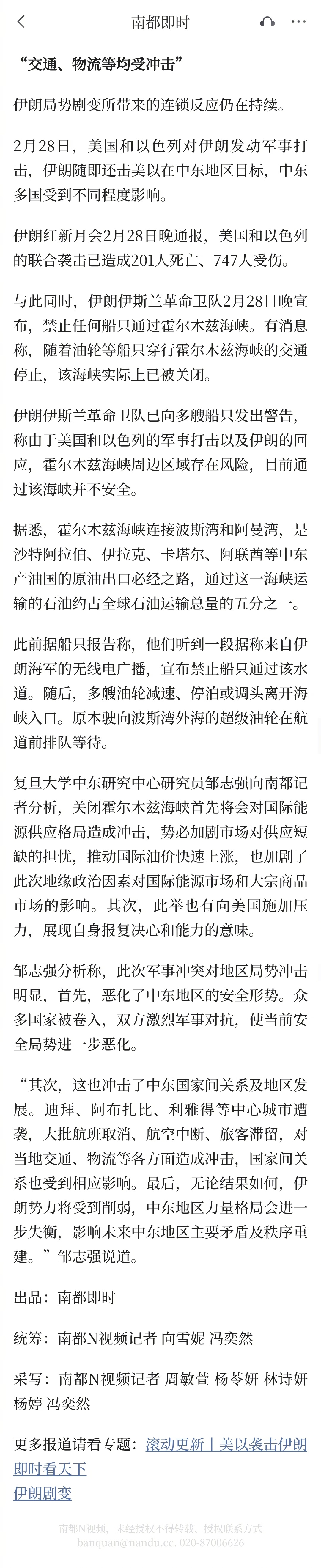 “此次军事冲突对地区局势冲击明显,迪拜、阿布扎比、利雅得等中心城市遭到袭击,大批航班取消、航空中断、旅客滞留,国家间关系也受到相应影响。”复旦大学中东研究中心研究员邹志强说道。3月1日,南都N视频记者连线多位身在中东地区的受访者,记录他们的遭遇。