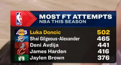 本赛季罚球出手次数最多球员: 第一:东契奇502次 第二:亚历山大465次 第三:阿夫迪亚441次 第四:哈登416次 第五:杰伦-布朗376次 这份榜单,东契奇和亚历山大排前两位不足为奇,这俩人一直都是罚球大师,但是排第三的是阿夫迪亚啊,上赛季你敢想象吗?