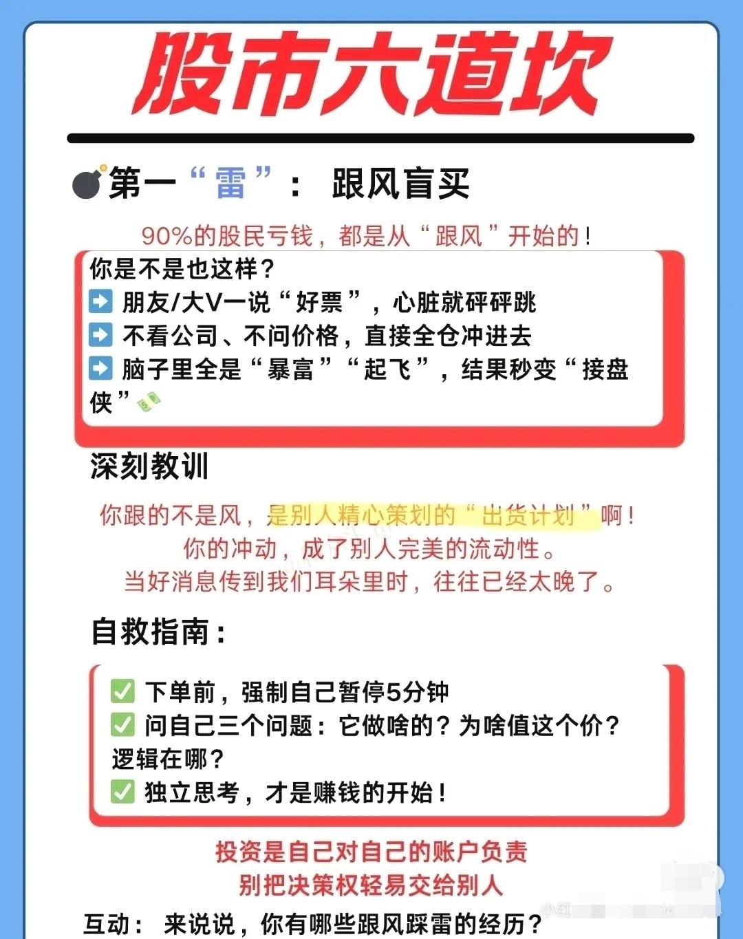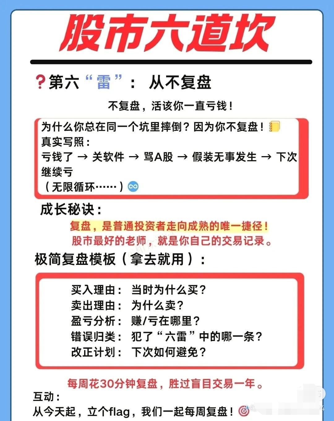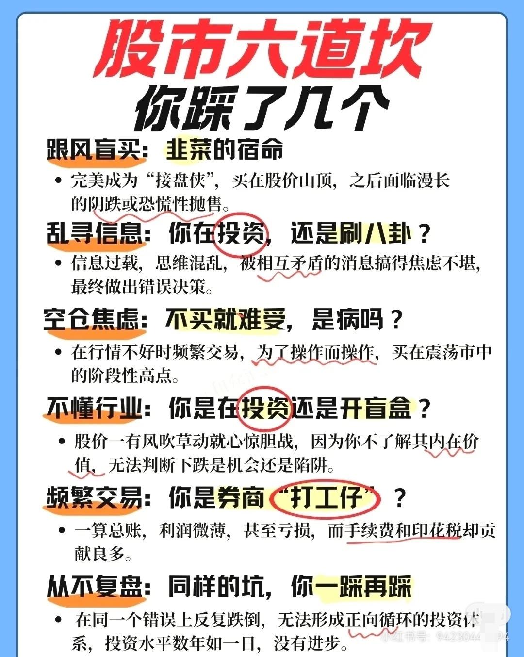 围绕 “股市六道坎”,分别讲了散户常见的六大投资陷阱及对应的自救建议: ① 跟风盲买 - 现象:听朋友或大V推荐就冲动买入,不看基本面、不问价格。 - 后果:高位接盘,股价长期阴跌。 - 教训:别人喊的好票,往往是出货时机;冲动成了别人的流动性。 - 建议:下单前停 5 分钟,问清公司业务、估值逻辑,坚持独立思考。 ② 乱寻信息 - 现象:关注太多 APP、群聊,沉迷“绝密内参”“明天必涨”之类标题党。 - 后果:信息过载、焦虑加剧,决策混乱。 - 教训:噪音 ≠ 有效信息,真正有价值的信息往往公开且枯燥。 - 建议:核心信源为公司财报、官方公告;辅助看券商研报的逻辑;建立自己的投资框架。 ③ 空仓焦虑 - 现象:账户有钱不买难受,大盘一涨就怕踏空,结果追高被套。 - 后果:频繁交易、买在阶段性高点。 - 教训:空仓是高级仓位管理,耐心比频繁出手更重要。 - 建议:像棒球手一样只打“甜球”;守住本金比抓每次波动重要百倍。 ④ 不懂行业 - 现象:不清楚所买公司的主营业务、盈利模式。 - 后果:投资变成赌博,风险极高。 - 教训:不懂的领域不要随便投。 - 建议:快速扫盲公司卖什么、卖给谁、盈利能力、竞争对手;从熟悉的行业和身边的好公司起步;遵循巴菲特原则——投资你懂的东西。 ⑤ 频繁交易 - 现象:赚一点就跑,解套就卖再追高,手续费高企。 - 后果:利润被手续费、印花税蚕食,甚至倒亏。 - 教训:频繁交易是财富“隐形杀手”。 - 建议:降低交易频率,看准再出手;树立长期主义;记住巴菲特:“不想持十年,就不要持十分钟”。 ⑥ 从不复盘 - 现象:亏钱后关软件、骂市场,不分析原因,循环再犯。 - 后果:永远在原地踏步,投资水平多年无提升。 - 教训:自己的交易记录是最好的老师。 - 建议:用极简模板复盘(买卖理由、盈亏分析、错误归类、改进计划);每周花 30 分钟复盘胜过盲目交易一年。 📌 总体启示: 这六道坎的本质都是 心态与纪律问题 —— 跟风、焦虑、懒惰、贪婪、急躁、逃避,都会导致亏损。解决之道在于:独立思考 + 信息筛选 + 仓位管理 + 行业认知 + 低频交易 + 定期复盘。