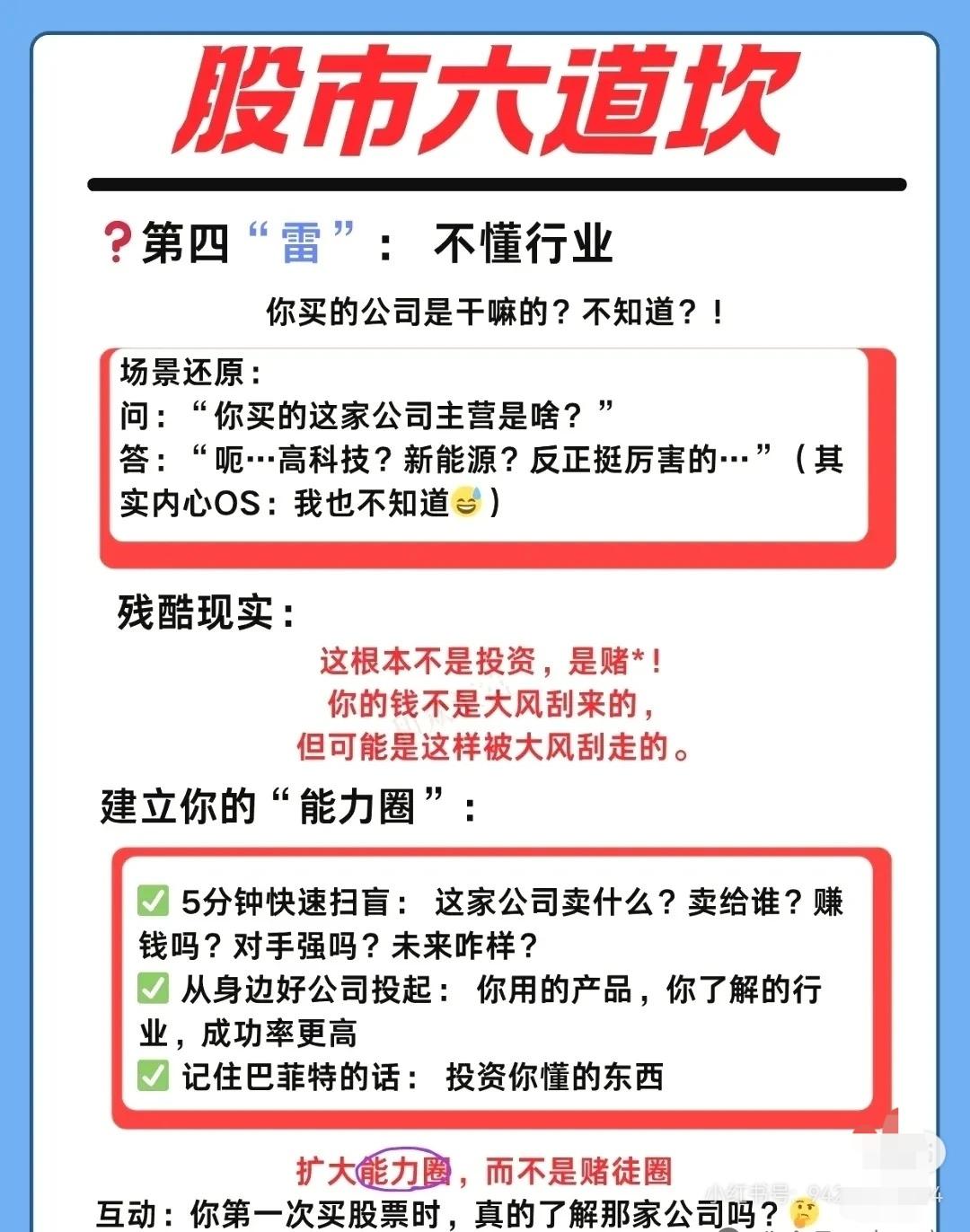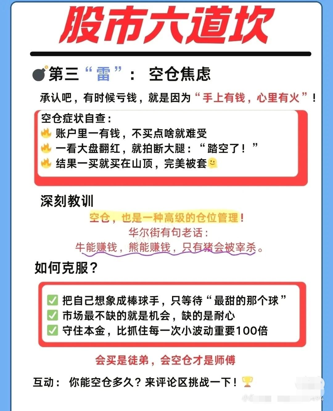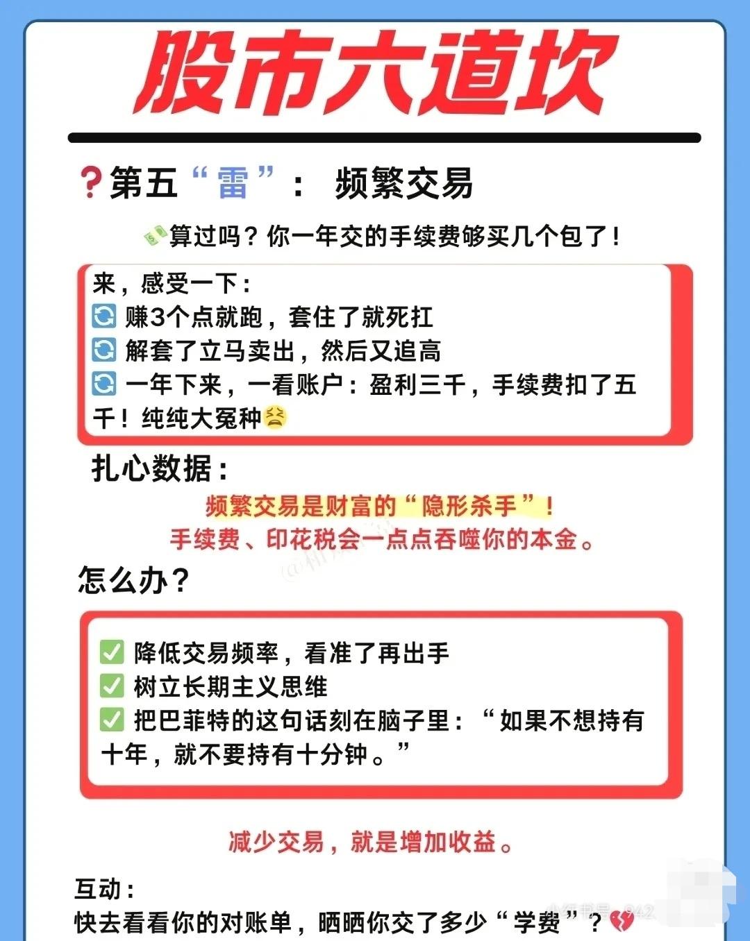 围绕 “股市六道坎”,分别讲了散户常见的六大投资陷阱及对应的自救建议: ① 跟风盲买 - 现象:听朋友或大V推荐就冲动买入,不看基本面、不问价格。 - 后果:高位接盘,股价长期阴跌。 - 教训:别人喊的好票,往往是出货时机;冲动成了别人的流动性。 - 建议:下单前停 5 分钟,问清公司业务、估值逻辑,坚持独立思考。 ② 乱寻信息 - 现象:关注太多 APP、群聊,沉迷“绝密内参”“明天必涨”之类标题党。 - 后果:信息过载、焦虑加剧,决策混乱。 - 教训:噪音 ≠ 有效信息,真正有价值的信息往往公开且枯燥。 - 建议:核心信源为公司财报、官方公告;辅助看券商研报的逻辑;建立自己的投资框架。 ③ 空仓焦虑 - 现象:账户有钱不买难受,大盘一涨就怕踏空,结果追高被套。 - 后果:频繁交易、买在阶段性高点。 - 教训:空仓是高级仓位管理,耐心比频繁出手更重要。 - 建议:像棒球手一样只打“甜球”;守住本金比抓每次波动重要百倍。 ④ 不懂行业 - 现象:不清楚所买公司的主营业务、盈利模式。 - 后果:投资变成赌博,风险极高。 - 教训:不懂的领域不要随便投。 - 建议:快速扫盲公司卖什么、卖给谁、盈利能力、竞争对手;从熟悉的行业和身边的好公司起步;遵循巴菲特原则——投资你懂的东西。 ⑤ 频繁交易 - 现象:赚一点就跑,解套就卖再追高,手续费高企。 - 后果:利润被手续费、印花税蚕食,甚至倒亏。 - 教训:频繁交易是财富“隐形杀手”。 - 建议:降低交易频率,看准再出手;树立长期主义;记住巴菲特:“不想持十年,就不要持十分钟”。 ⑥ 从不复盘 - 现象:亏钱后关软件、骂市场,不分析原因,循环再犯。 - 后果:永远在原地踏步,投资水平多年无提升。 - 教训:自己的交易记录是最好的老师。 - 建议:用极简模板复盘(买卖理由、盈亏分析、错误归类、改进计划);每周花 30 分钟复盘胜过盲目交易一年。 📌 总体启示: 这六道坎的本质都是 心态与纪律问题 —— 跟风、焦虑、懒惰、贪婪、急躁、逃避,都会导致亏损。解决之道在于:独立思考 + 信息筛选 + 仓位管理 + 行业认知 + 低频交易 + 定期复盘。