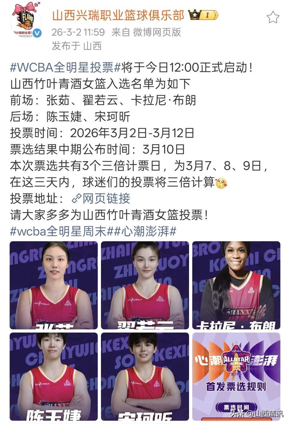 WCBA全明星投票今日正式启动!球迷吐槽投票链接无法进入! 从今天12时起,WCBA全明星投票正式启动,山西竹叶青酒女篮一套主力阵容进入候选名单:前场张茹、翟若云、卡拉尼·布朗,后场陈玉婕、宋珂昕。其中张茹和并未出战本赛季常规赛,却被列为候选名单。2026年3月2日-3月12日为投票日。其中3月7、8、9日为三倍记票日。有球迷已经开始为自己心爱的球员投票,但是官方给出的投票通道并不通畅,无法进入!建议WCBA 官方及时处理一下。 南区和北区各有26名球员,进入全明星阵容候选。山西女篮、四川女篮、东莞女篮各有五名球员入选,江苏和上海各有四名球员入选。山西球迷认为,山西女篮有五位球员进入全明星候选名单属于正常情况,毕竟山西女篮是WCBA常规赛第一、俱乐部杯第一阶段第一的球队。