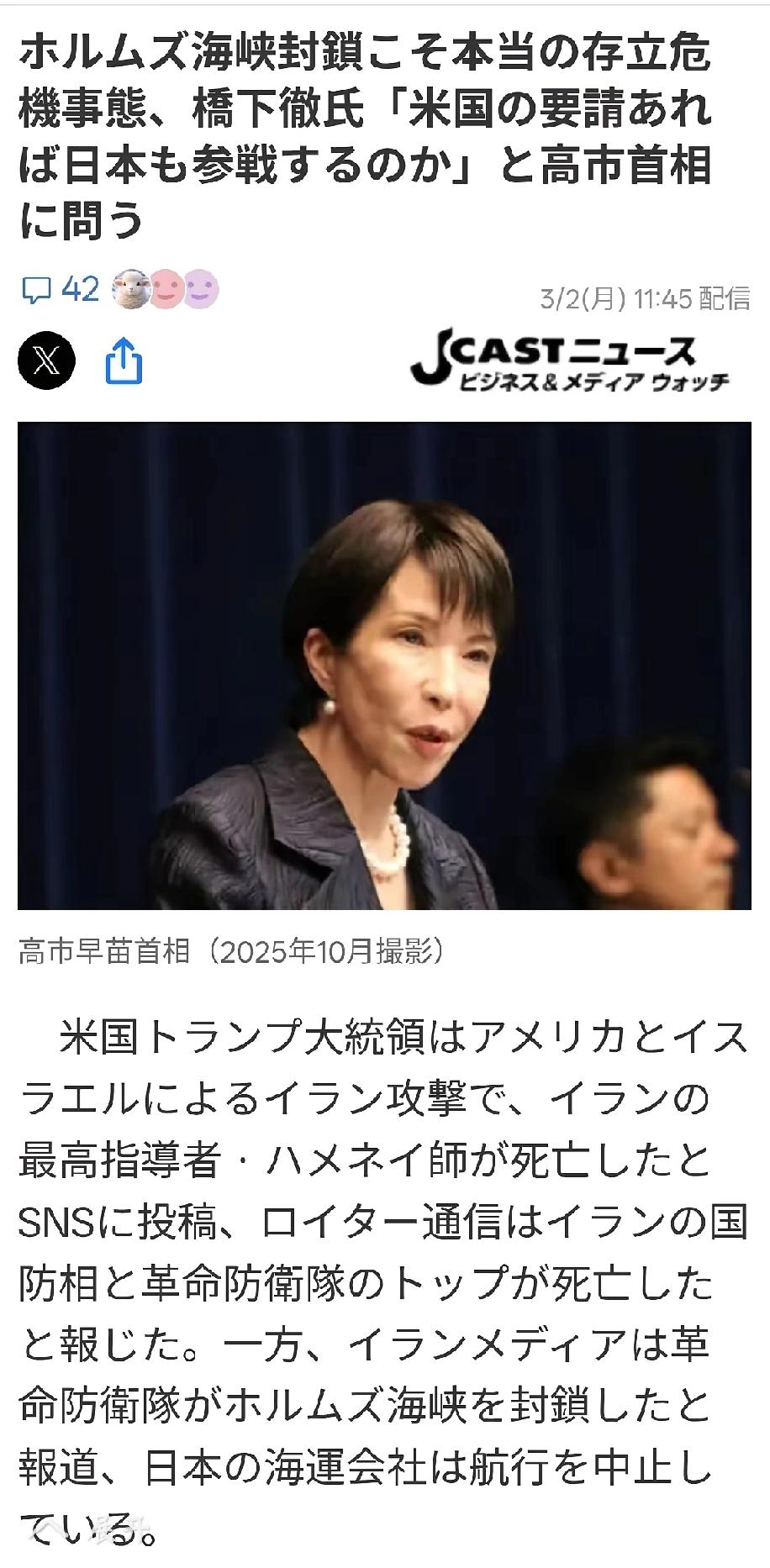 3月2日日媒《J-CASR NEWS》报道:伊朗革命卫队封锁了霍尔木兹海峡,日本航运公司已暂停航运。桥下彻在富士电视台的一档栏目中表示:“这才是日本的生存危机,高市早苗曾就台湾紧急状态发表答辩言论,引发了各种问题。但是现在却因伊朗受到美以打击,面临真正的生存危机。如果美军遭到攻击并被要求日本提供支援,日本会怎么做?尽管高市首相知道美国参与了对伊朗的袭击,她却仍前往石川县参与支持知事选举发表演讲。发现危机管理意识不足,面临重大问题后,匆忙返回东京,但一直拖延到2月28日晚,才召开国家安全会议,首相办公室难道无法应对“生存危机”吗?” 个人认为:可以理解为某一部分日本人“恨铁不成钢”以一种表面指责,本质为协助的方式,进行为高市早苗进行政治掩护行动。 这也能够看得出来,日本人非常精于战术动作,但却缺乏战略眼光。 看来日本国民可以对高市早苗首相公开的发表:“别给我丢人”,把高市早苗的话原封不动的送给她。 个人认为:非常明显,美国和以色列要求盟友日本,做出侵略战争支援,这一合理要求。 全球舆论,重点观注,日本答复。