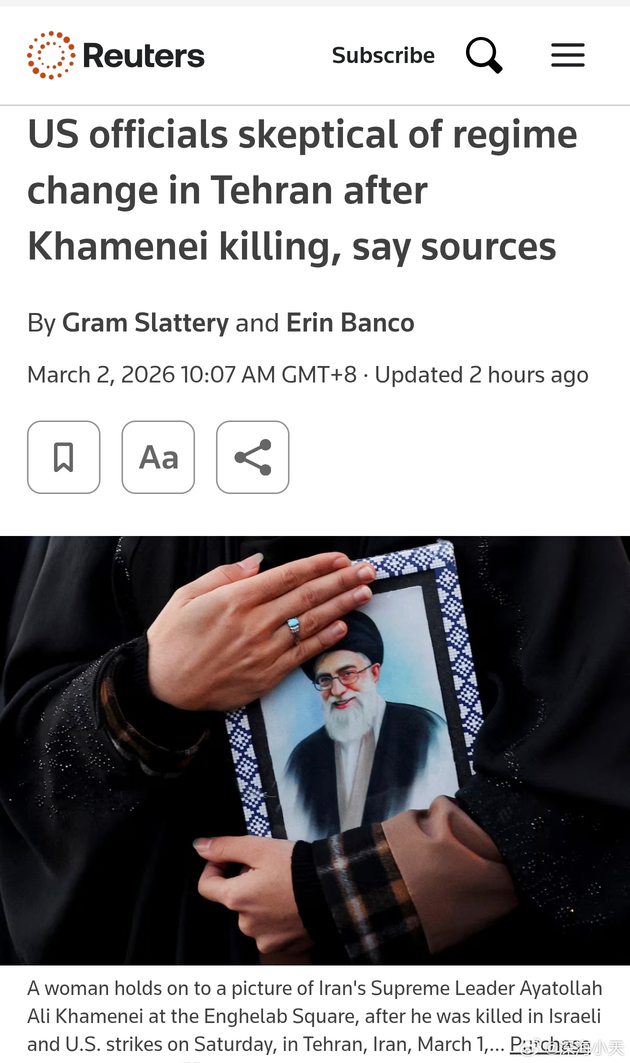 路透社:美官员不看好伊朗政权更迭路透社核心报道披露,多名美国高级官员(含情报界人士)对哈梅内伊遇袭后伊朗短期内政权更迭持严重怀疑态度。美方认为伊朗反对派已被严重削弱,难以推翻1979年以来的神权体系,即便最高领袖身亡,伊朗体制也不太可能崩溃剧变。CIA袭击前评估显示:哈梅内伊若身亡,继任者更可能是伊斯兰革命卫队强硬派或保守教士,而非改革派,现行体制或被强化而非削弱。特朗普说伊朗许多人打电话投降伊朗导弹击中耶路撒冷现场画面