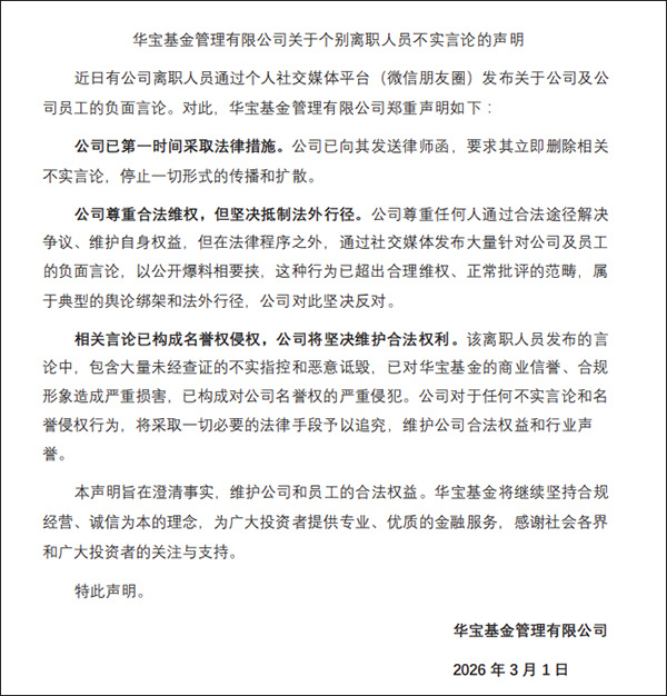 声明称,该离职人员发布的言论中,包含大量未经查证的不实指控和恶意诋毁,已对华宝基金的商业信誉、合规形象造成严重损害,已构成对公司名誉权的严重侵犯。公司对于任何不实言论和名誉侵权行为,将采取一切必要的法律手段予以追究,维护公司合法权益和行业声誉。