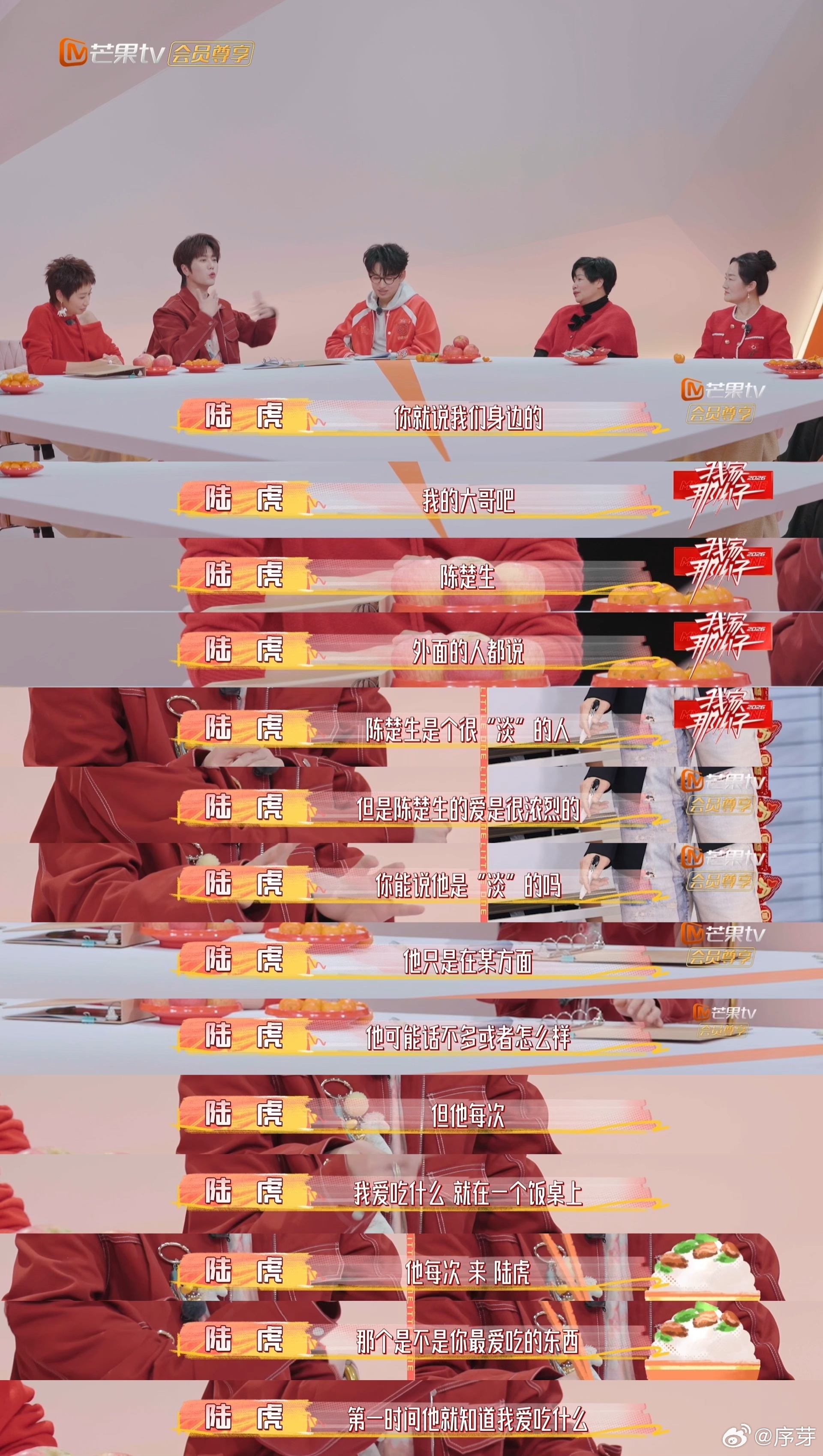 陆虎说陈楚生虽淡但爱很浓烈 陈楚生是个低调的人,但他对朋友的关心却无处不在。每次聚会,他总能第一时间知道大家喜欢什么,虽然话不多,但他的爱永远在细节中体现。 我家那小子