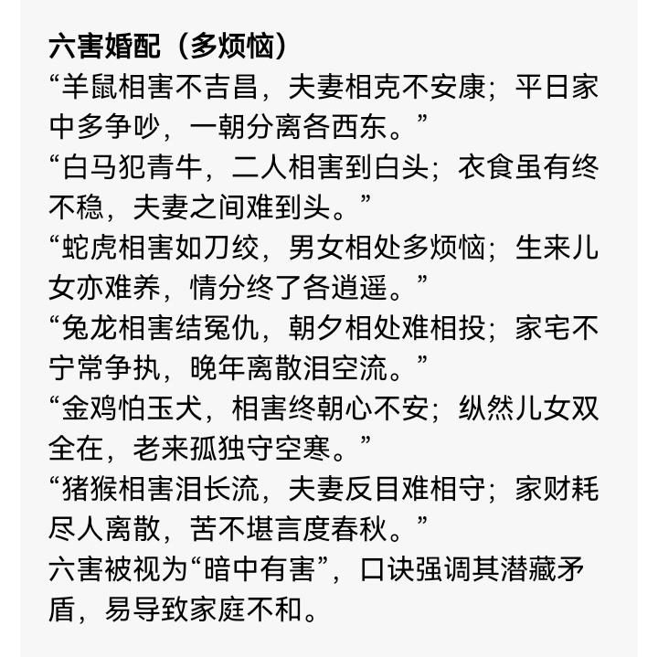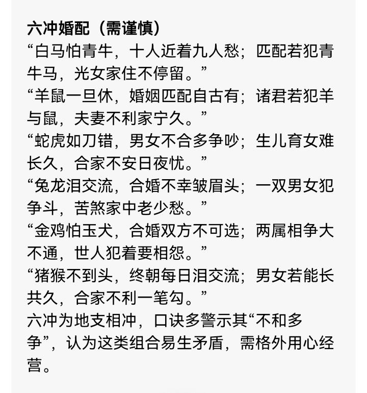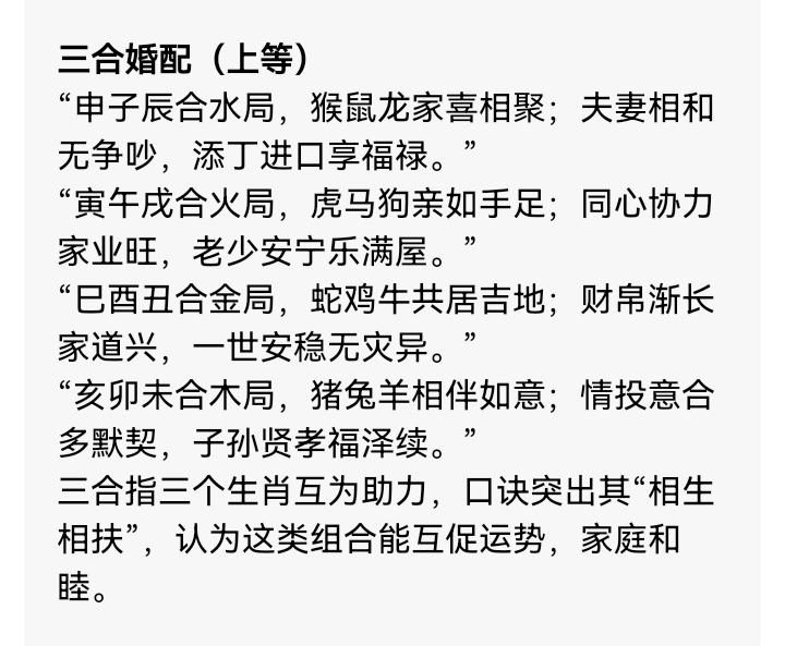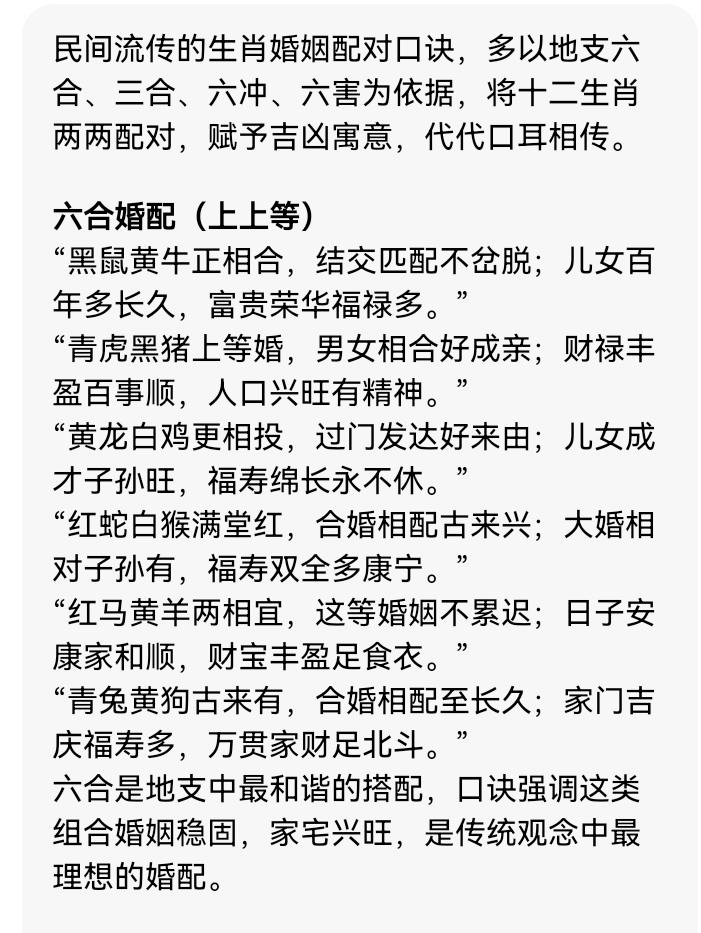 有意思的生肖婚配口诀,看看你家属于哪个[笑][笑]: 鼠配牛,勤与稳,日子踏实少纷争; 虎配马,志相投,携手闯荡不犯愁。 兔配狗,情相投,互敬互爱到白头; 龙配鸡,运亨通,家和业兴喜事融。 蛇配猴,智相投,同谋共划乐悠悠; 马配羊,暖融融,温情蜜意过秋冬。 猴配鼠,巧经营,小日子里有乾坤; 鸡配蛇,心相契,细水长流情不移。 狗配虎,共担当,风雨同舟志如钢; 猪配兔,福满堂,安稳度日岁月长。 友友们有没有补充的,[呲牙][呲牙] ps:仅供娱乐,莫要当真[大笑][大笑]。
