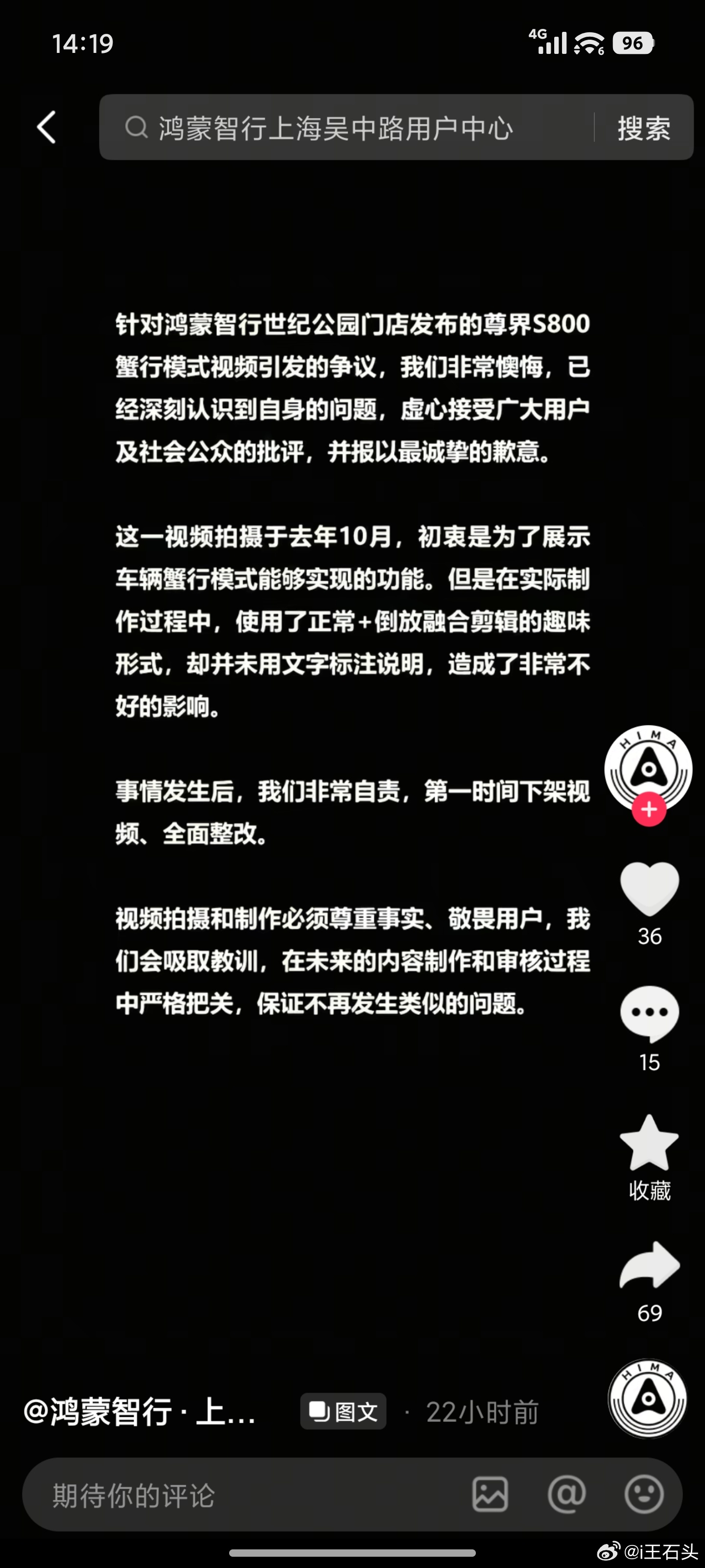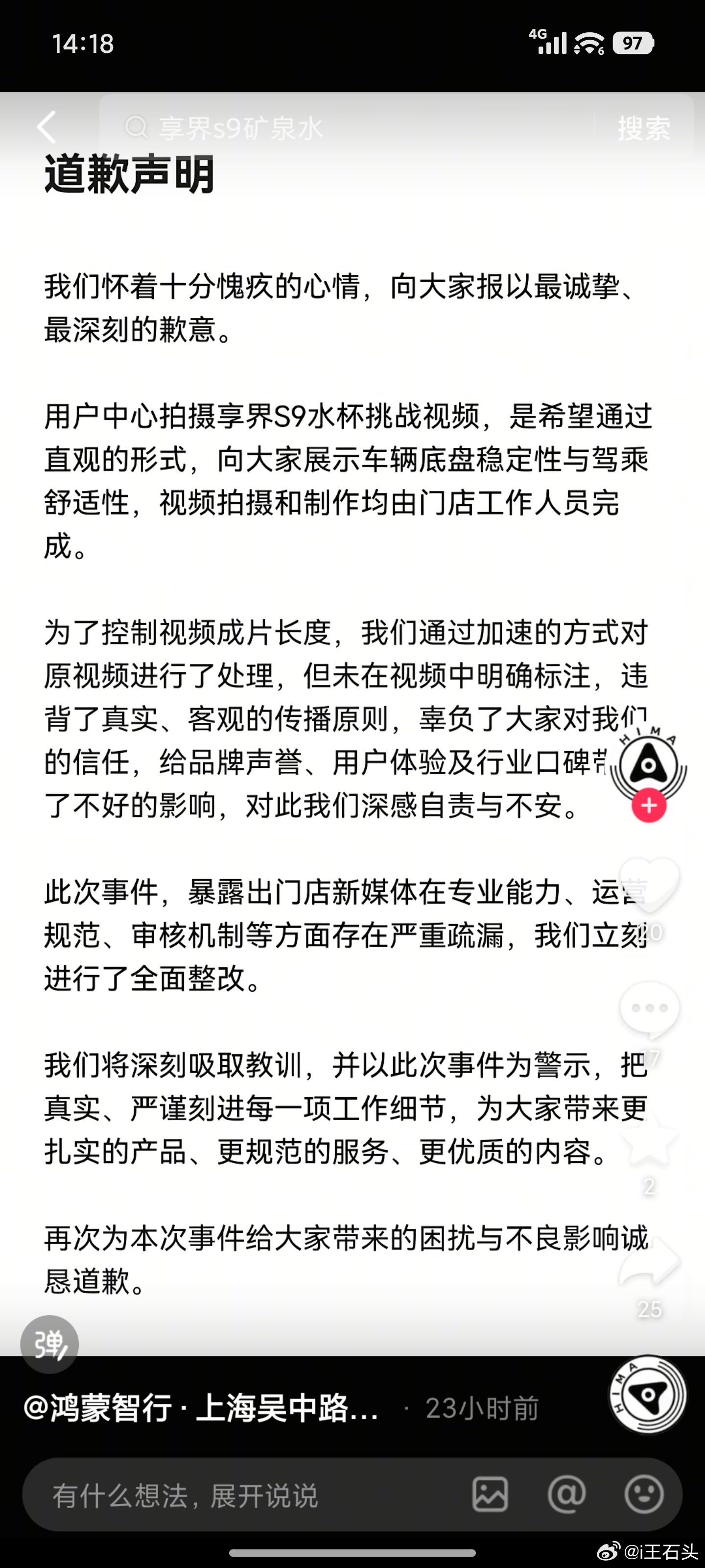 鸿蒙智行问责,门店公开道歉。鸿蒙智行·上海吴中路用户中心表示,享界S9水杯挑战视频的视频拍摄和制作均由门店工作人员完成,目的是向大家展示车辆底盘稳定性和驾乘舒适性。但为了控制视频的长度,所以采用了加速的方式。对于品牌声誉、用户体验及行业口碑等带来的不良影响道歉。鸿蒙智行·上海世纪公园用户中心店也发布道歉声明表示,尊界S800蟹行模式视频拍摄于去年10月,目的为了展示蟹行功能,使用了混合剪辑的趣味形式,造成了不好影响,已下架视频并全面整改。