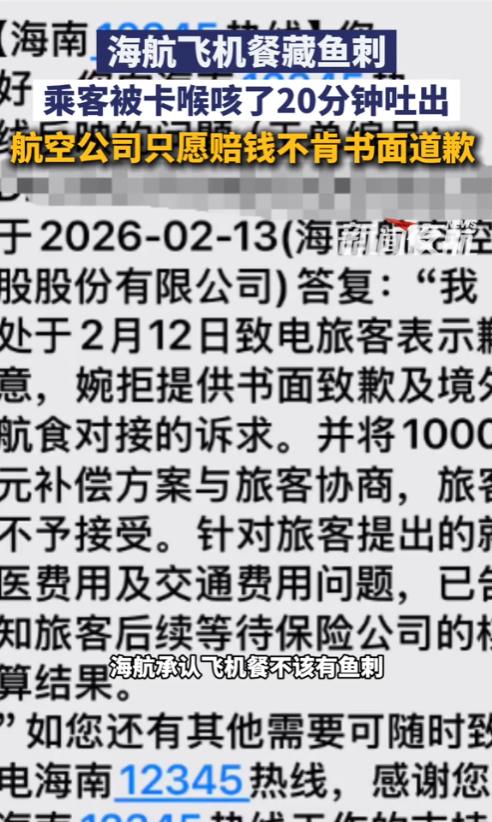 广东深圳,一男子在新西兰飞回深圳的航班上吃了饭,结果被一根细长的鱼刺卡在了喉咙里。由于当时正处于万米高空中,所以他只能硬生生咳了20分钟才把鱼刺给吐了出来。事后,航空公司针对此事向男子道了歉,并提出补偿1000元。但男子要求航空公司书面道歉,并赔偿医疗费和交通费,可航空公司不仅拒绝了书面道歉,还说这是第三方供餐公司的错,想要甩锅。 男子乘坐的航班从新西兰起飞后,经过一段时间的飞行,机组人员开始分发机上餐食。奔波许久的他,也趁着这个机会补充能量, 可就在吃下一口米饭的瞬间,喉咙里突然传来一阵尖锐的刺痛,像是有什么细长的东西死死扎在了喉咙深处,那种异物感瞬间让他浑身紧绷。 他下意识地想把异物咳出来,可无论怎么用力,那根鱼刺都纹丝不动,反而因为咳嗽的震动,扎得喉咙更疼,甚至连吞咽口水都变得异常艰难。 更让人无奈的是,此时航班正处于万米高空,远离地面,无法及时获得专业的医疗救助,机组人员虽然及时赶到,却也只能提供简单的安抚,没办法帮他取出鱼刺。 按照民航相关规定,机组成员虽经过紧急医学事件处置训练,但并不具备专业急救人员的水平,无法开展复杂的异物取出操作。 就这样,男子只能硬生生靠着反复咳嗽、干呕,一点点尝试将鱼刺排出,每一次咳嗽都伴随着剧烈的疼痛,喉咙像是被无数根细针反复穿刺,额头上布满了冷汗,胸口也因为持续的咳嗽变得发闷。 这漫长的20分钟,对他来说仿佛一个世纪那么久,他甚至一度担心,自己可能要在这万米高空中栽在一根小小的鱼刺上,那种无助和恐惧,只有亲身经历过的人才能体会。 好在坚持了20分钟后,随着一阵剧烈的干呕,那根细长的鱼刺终于被他吐了出来,喉咙里的刺痛感虽然没有立刻消失,但那种窒息般的压迫感终于得到了缓解,他也长长舒了一口气,悬着的心才算彻底放下。 这场突如其来的意外,让他原本疲惫的旅途更添了几分狼狈,喉咙也因为长时间的咳嗽和鱼刺的划伤,变得红肿不适。 航班顺利抵达深圳后,男子第一时间就此事向涉事航空公司进行了反馈,讲述了自己在高空被鱼刺卡喉的惊险经历,以及由此带来的身体不适。 没过多久,航空公司就针对此事作出了回应,向男子表达了歉意,同时提出了1000元的经济补偿,希望能就此了结此事。 可男子并没有接受这份补偿,他表示,自己在意的不是金钱,而是航空公司的态度。他认为,机上餐食出现能卡喉的细长鱼刺,本身就是食品安全上的疏漏, 毕竟按照航空配餐的相关约定,供餐方应严格把控餐食质量,避免出现此类可能危害乘客安全的隐患。 因此,他提出了两个合理诉求:一是要求航空公司出具书面道歉,正视自身的服务疏漏;二是赔偿自己后续因喉咙不适产生的医疗费,以及为处理此事产生的交通费。 让人没想到的是,面对这样的诉求,航空公司却明确拒绝了出具书面道歉的要求,只愿意维持1000元的补偿方案。 更让男子不满的是,航空公司在沟通中反复强调,机上餐食是由第三方供餐公司提供的,此次出现鱼刺问题,责任应该在第三方,试图将自身的责任摘干净,完全没有主动承担责任的态度。 要知道,根据航空配餐服务的相关合同约定,即便餐食由第三方供餐公司提供,航空公司作为承运人,也有义务对餐食质量进行审核和监管,不能因为第三方的问题就推卸自身的责任。 而且按照民航局的相关规定,航空公司有义务保障乘客在飞行过程中的人身安全,包括提供安全的机上餐食。 目前,双方仍就此事僵持不下,男子表示,自己不会放弃维权,会继续和航空公司沟通,直到对方给出合理的回应。 一场看似小小的鱼刺风波,不仅暴露了航空配餐环节的疏漏,也让大家关注到,万米高空之上,乘客的应急保障和合法权益,到底该如何得到更好的保障。对此,你们有什么看法,欢迎评论留言~