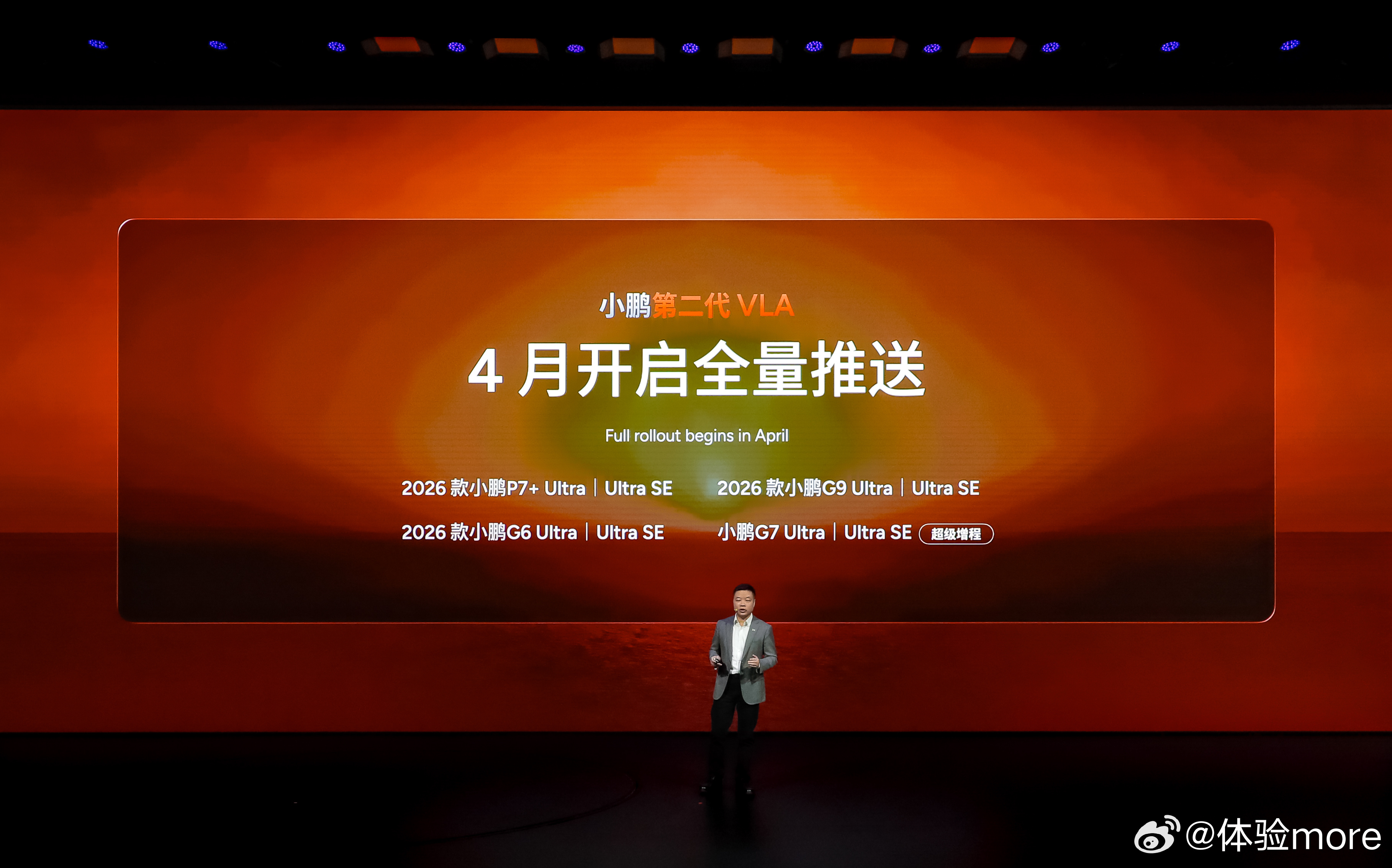 4月份小鹏所有Ultra车型都会推送。包括2026款小鹏P7+ Ultra|Ultra SE、2026款小鹏G6 Ultra|Ultra SE、2026款小鹏G9 Ultra|Ultra SE、小鹏G7 Ultra|Ultra SE超级增程。小鹏第二代VLA发布新款小鹏X9纯电版今日上市