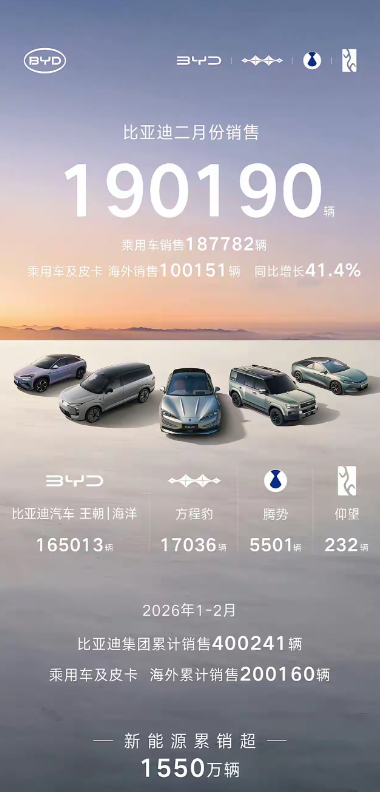2月比亚迪销量同比增长41.4%,加上搭载很多领先全球技术的车型即将上市,相信3月以后销量会继续猛增,26年一定会干翻吉利、长城,比亚迪用实力让那些黑粉闭嘴,太解气了