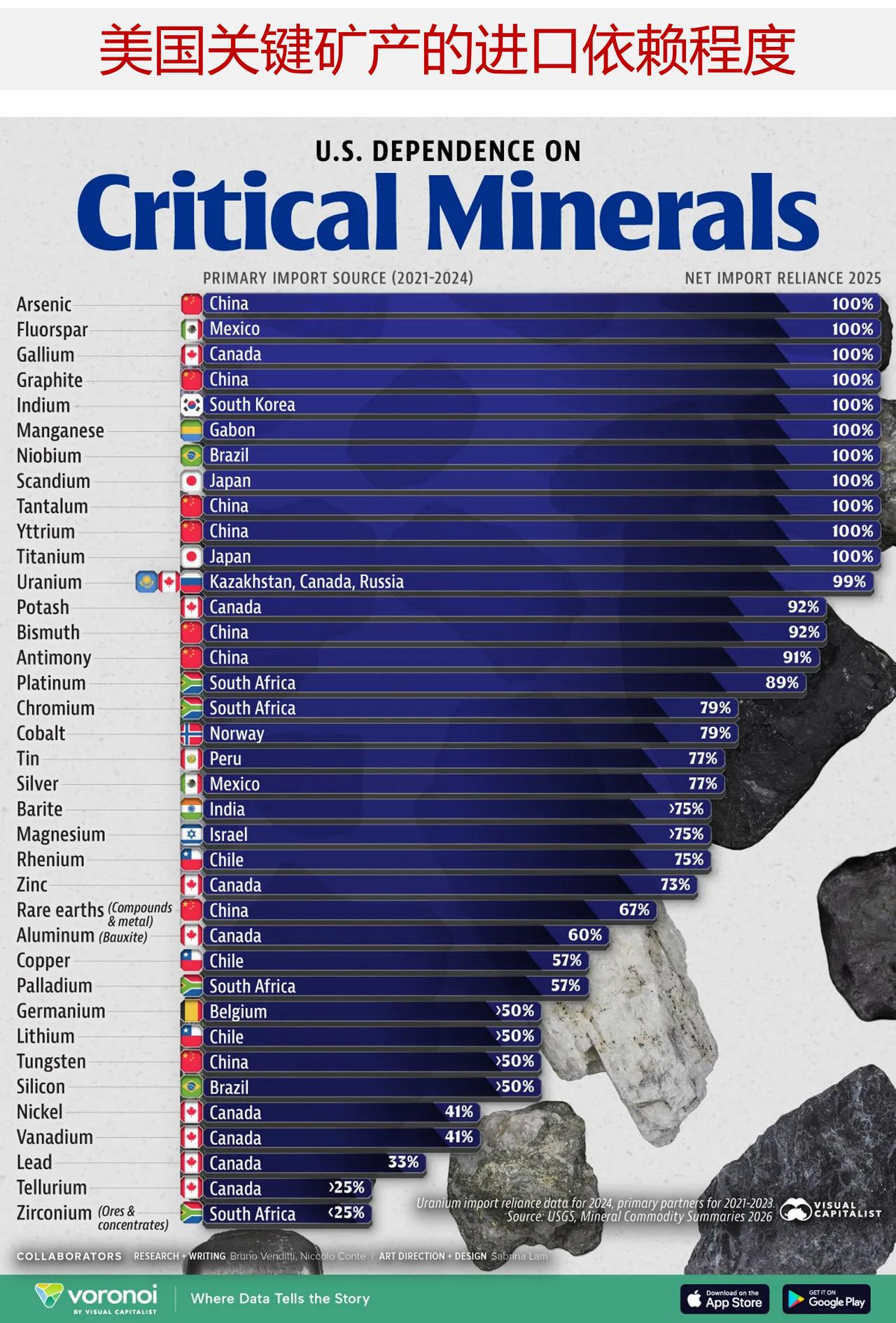 美国对 37 种关键矿产的进口依赖程度如何? 美国在生产半导体、电动汽车电池、国防系统以及核能所必需的许多矿物方面都依赖于外国供应商。 下面的图表展示了 2025 年美国在 37 种关键矿产方面的净进口依赖程度,以及 2021 年至 2024 年期间这些矿产的主要供应国情况。该数据来自美国地质调查局(USGS)。 在列出的 37 种关键矿产中,有 11 种完全依赖进口,这意味着美国根本没有这些矿产的本土生产。还有其他一些矿产的供应有超过一半依赖于国外来源。 在该列表中,中国是重要的供应国,是诸如石墨、砷、钽和钇等材料的主要供应地。 ——完全依赖进口的矿产 一些在战略上至关重要的材料完全依赖进口。石墨和钽主要来自中国。镓主要来自加拿大,锰则主要来自加蓬,而铌则主要来自巴西。 就连诸如钪和钇这类在航空航天合金及电子领域中使用的特殊元素,也全部依赖进口。这种完全的依赖性使得供应链极易受到地缘政治风险和贸易中断的影响。 铀是核能不可或缺的原料,但其 99%的供应依赖进口,主要供应国为哈萨克斯坦、加拿大和俄罗斯。 ——中国的重要作用 中国在美国的矿产供应链中占据着核心地位。它是砷、石墨、钽、钇、锑以及稀土化合物和金属的主要供应国。 稀土对于清洁能源技术以及国防系统而言尤为重要。尽管美国在稀土进口方面依赖度高达 67%,但中国在全球稀土加工产能方面仍占据主导地位。 这种高度集中的情况造成了战略上的脆弱性,尤其是在全球范围内电池材料和先进电子产品的竞争日益激烈的情况下更是如此。 ——能源转型与工业金属 除了那些小众的元素外,美国在工业和能源转型所需的金属方面也严重依赖进口。锂(超过 50%依赖进口)主要来自智利。钴(79%)主要从挪威进口,而镍(41%)和锌(73%)则主要依赖加拿大供应。 就连铝(铝土矿)的进口依赖度也达到了 60%,主要来源地是加拿大。而用于电力供应的铜,其进口依赖度为 57%,主要供应国是智利。 随着对电动汽车、电网基础设施以及清洁能源系统的需求不断增长,确保这些材料的稳定供应仍将是对美国工业和能源战略至关重要的核心问题。
