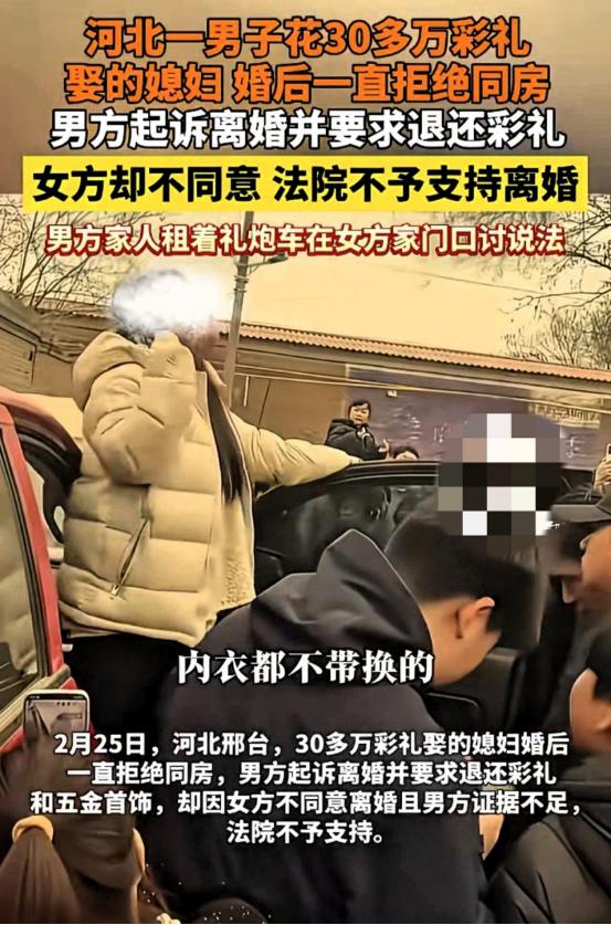 “家丑外扬!”河北邢台,男子给了女子30多万彩礼,二人登记结婚,可婚后女子拒绝同房,结婚10个月还分房睡,女子甚至睡觉都不脱衣服,极少换衣服,更不让丈夫碰,男子无奈提出离婚,让人奇怪的是,女子既不同意离婚,也不退彩礼。男子告上法院,要求离婚,法院不支持离婚,一怒之下租礼炮去女方家要说法。 “你要是真想跟我过日子,就别碰我!听到妻子再次说这句话时,丈夫再也忍不了了。那时他们已经领证十个月,可两人却从未有过夫妻之实。 更让男子无法接受的是,妻子睡觉从不脱衣服,内衣也很少换,大部分时间住在娘家,偶尔回来也像客人一样沉默。 而就在一年前,男方家里东拼西凑,拿出了30多万元彩礼、金饰和手机迎娶妻子的时候,女方的态度明明不是这样的! 事情还要从2024年春节说起。男方家是农村的,算不上多富裕,父母一辈子省吃俭用,就盼着儿子成家。 好不容易相亲了一个姑娘,可女方家要张口就要25万多彩礼,加上“五金”和一部苹果手机,总共三十多万。 为了这场婚礼,男子几乎掏空了所有积蓄。可谁也没想到,婚礼热闹过后,婚姻却迅速陷入冰点。 婚后第二天,妻子就拒绝同房,起初男子以为是害羞,耐心等了几个月。可时间越久,情况越怪:妻子不仅坚持分房睡,连基本的生活交流都没有,回娘家一住就是几周。 询问原因,对方要么沉默,要么冷言冷语。十个月里,夫妻两人可谓是形同陌路。最终男子实在撑不下去了,起诉离婚,并要求退还彩礼。 可上了法庭,妻子却说根本不存在拒绝同房这事,俩人一直在一张床上睡觉,感情好着呢。反倒是丈夫婚后好吃懒做,没收入,成天就想着那事,连她生理期都不放过,被她拒绝后还动手打骂,限制她的人身自由。 女方甚至还拿出了自己被确诊为重度抑郁症的诊断报告,以及2025年5月在医院的住院的票据;至于那笔彩礼,她也说花在了婚后共同生活的开销上。 法院审了半天,也为难。最终还是驳回了男子请求,理由是:现有证据不足以证明感情彻底破裂,而且女方也不同意离婚。判决下来后,男方一家崩溃了:钱要不回来了,人也得不到。 绝望之下,家人租了一辆礼炮车,气势汹汹的就开到女方家门口,边放炮边拉出横幅:“还我血汗钱!” 这件事传到网上后,不少人都替男子喊冤,还有很多人好奇,日子都过成这样了,为什么女方就是不愿意离婚呢?这个答案或许只有她自己才清楚。 好在当地妇联和司法所已介入调解,男方也撤走了礼炮车,据说双方正在谈部分退款。 对此你有什么看法?欢迎在评论区留言讨论。婚姻 彩礼 信息来源: 封面新闻2026-2-27|女子婚后拒同房法院判定不予离婚,男方租礼炮车赴女方家抗议,律师:男方“讨说法”方式涉嫌违法 文|墨海 编辑|史叔