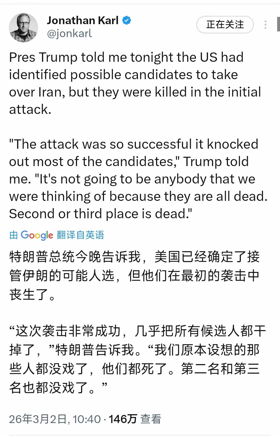 傀儡全死了,特朗普失算了! 第一件事:伊朗已经确定,伊精神领袖哈梅内伊的亲信——阿亚图拉・阿里礼萨・阿拉菲将临时履行最高领袖职责。他完整继承了哈梅内伊的衣钵,对美强硬。这说明,伊朗亲美派没能上位。 第二件事:特朗普亲口承认——美国曾经准备培养的傀儡,在这次袭击中,几乎全部丧生。特朗普对记者说:“我们原本设想的那些人都没戏了,他们都死了。第二名和第三名也都没戏了。”