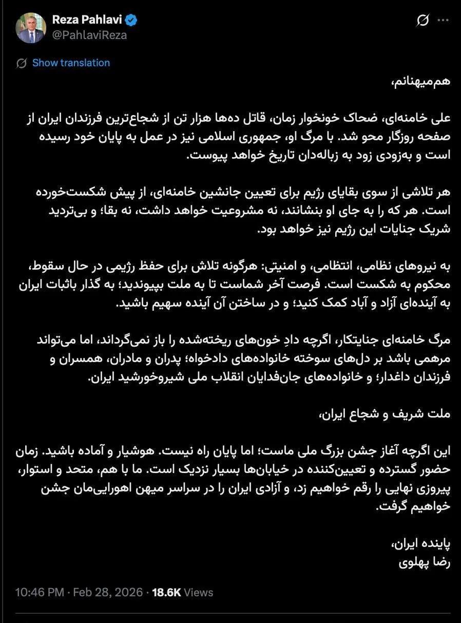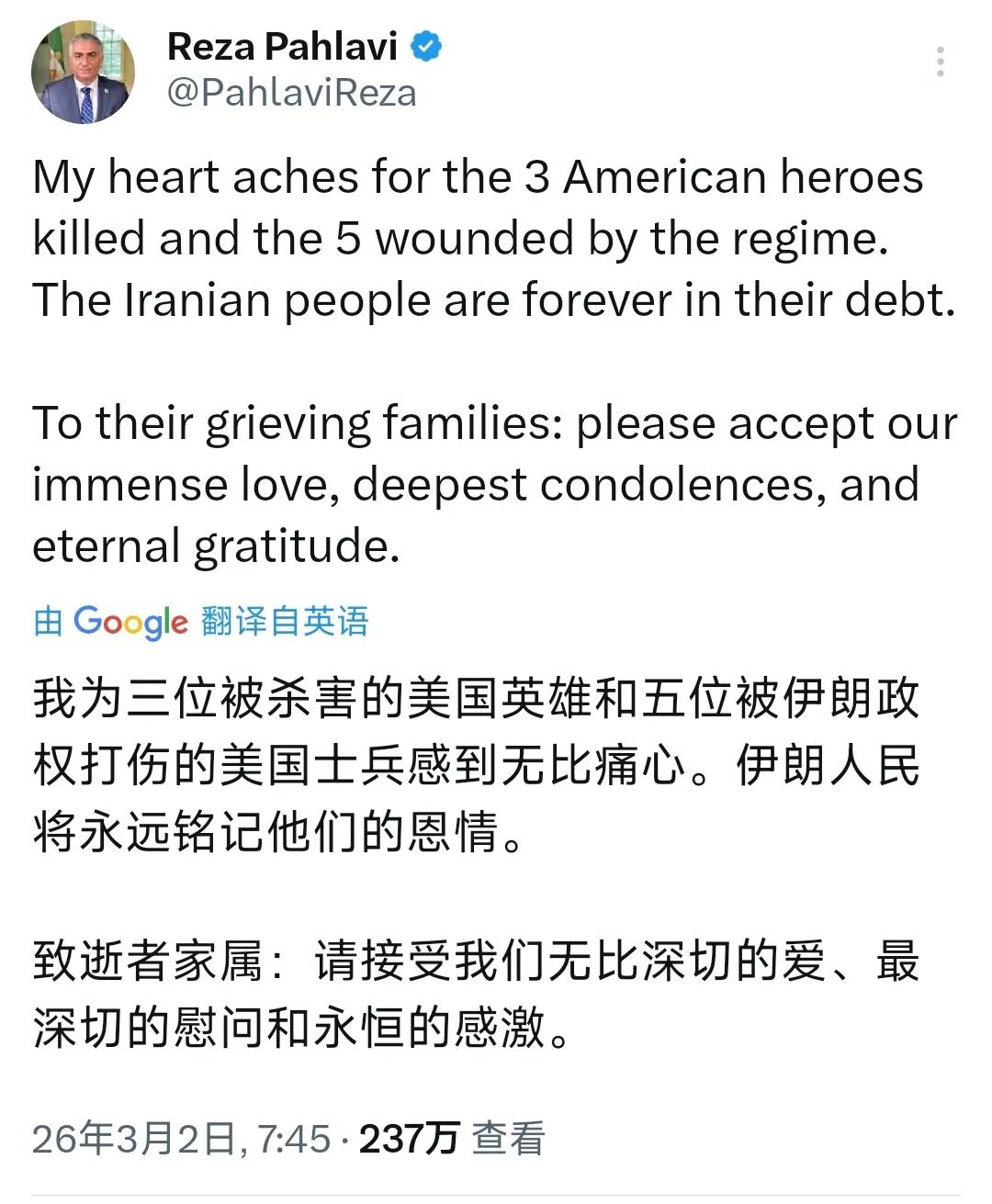 伊朗末代王储礼萨.巴列维今天(3月2日)写道:“我为三位被杀害的美国英雄和五位被伊朗政权打伤的美国士兵感到无比痛心。伊朗人民将永远铭记他们的恩情。致逝者家属:最深切的慰问和永恒的感激。” 巴列维典型的数典忘祖之辈,又有哪些伊朗人会铭记美国的恩情?巴列维的媚美言论,美国人也不会太过在意。上世纪七十年代,随着石油美元体系的建立,伊朗也从中受益,但是财富却集中在少数人手中,引发伊朗内乱,加之质疑美国的石油定价体系,而被美国卡持政府所拋弃,其政权于1979年被推翻。现身在埃及的巴列维坐等翻盘的机会,昨天他发文(图3)呼吁伊朗民众再次走上街头发动新的动乱,呼吁伊朗军队、警察放下武器,阻止哈梅内伊新的继承人上台,但巴列维的影响力式微,其重新上台的机会微乎其微。