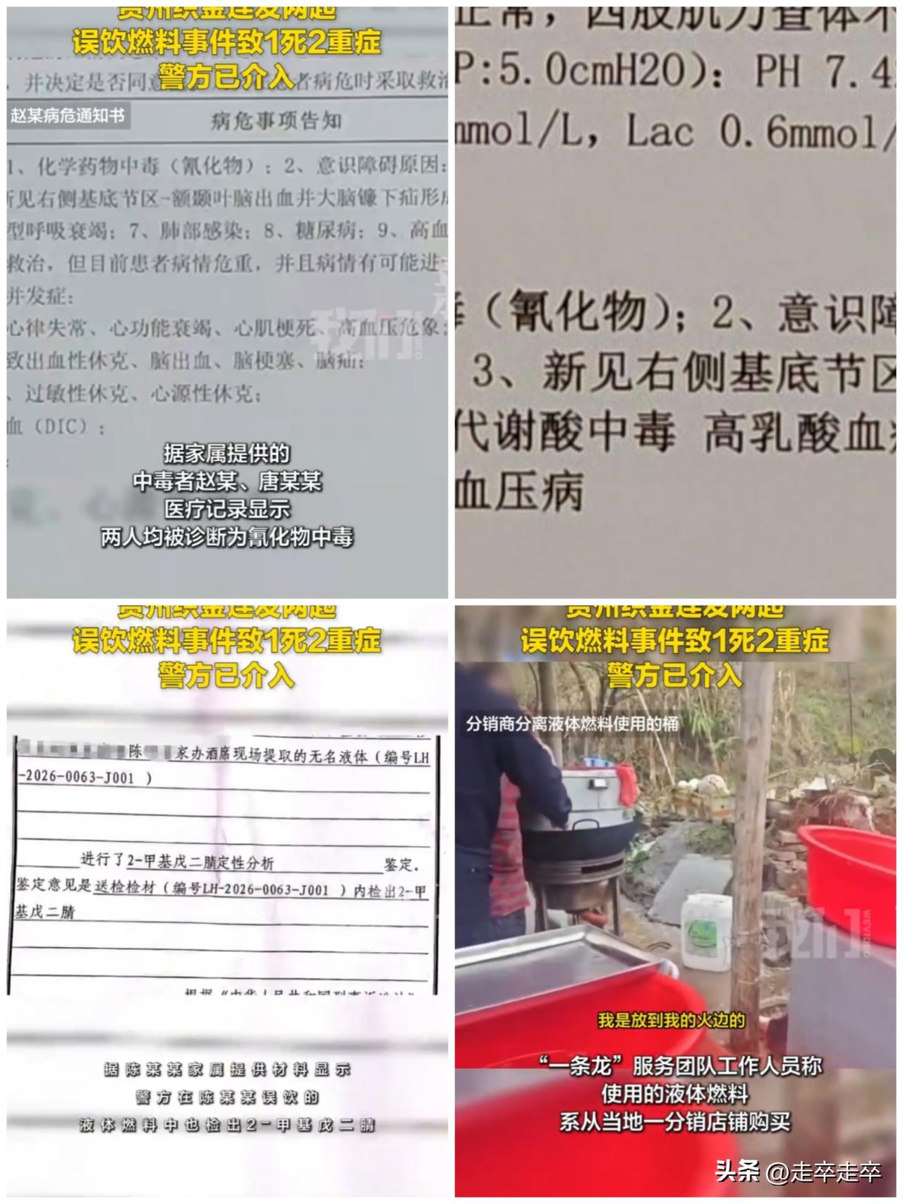 贵州毕节织金县40天内连续发生两起婚宴误饮剧毒燃料事件。 1月26日鸡场乡村民陈某某参加邻居婚宴时,误饮餐桌上白色塑料壶中的液体燃料(抢救无效后不幸身亡)。2月9日三甲街道63岁赵某与50多岁唐某在婚宴中,同样误饮桌边白色塑料壶内的燃料(目前仍在抢救中)。两起事件经警方鉴定其误饮液体都含剧毒有机物2-甲基戊二腈(有机氰化物)。 涉事宴席均由[商业行为一条龙服务团队]操办,燃料被直接放置在触手可及处,未专库存放或粘贴警示标签,形成致命隐患(其中一个团队称是放在火炉边,是受害者自行取用)。虽然两起事件涉事团队非同一团队人员,但均存在相同管理失职。 涉事燃料当地俗称“七号白油”,含乙醇成分能够散发出来酒味,视觉和嗅觉均难与白酒区分。且外包装容器与本地散装自酿白酒壶均是白色塑料材质,无任何警示标识(有手写的)。乙醇及2-甲基戊二腈为高毒性有机氰化物,微量摄入即可通过口腔或皮肤接触导致多器官衰竭,死者血液中该物质浓度已超致死水平。 目前燃料生产厂家称出厂产品“仅含粗液体蜡”,否认添加甲醇或2-甲基戊二腈,警方正开展调查。分销店铺目前已暂停营业,当地市场监管局已对其库存燃料抽样检测,结果尚未公布。织金县已经成立联合调查组,重点追查剧毒成分来源及流通环节。 饮酒事故