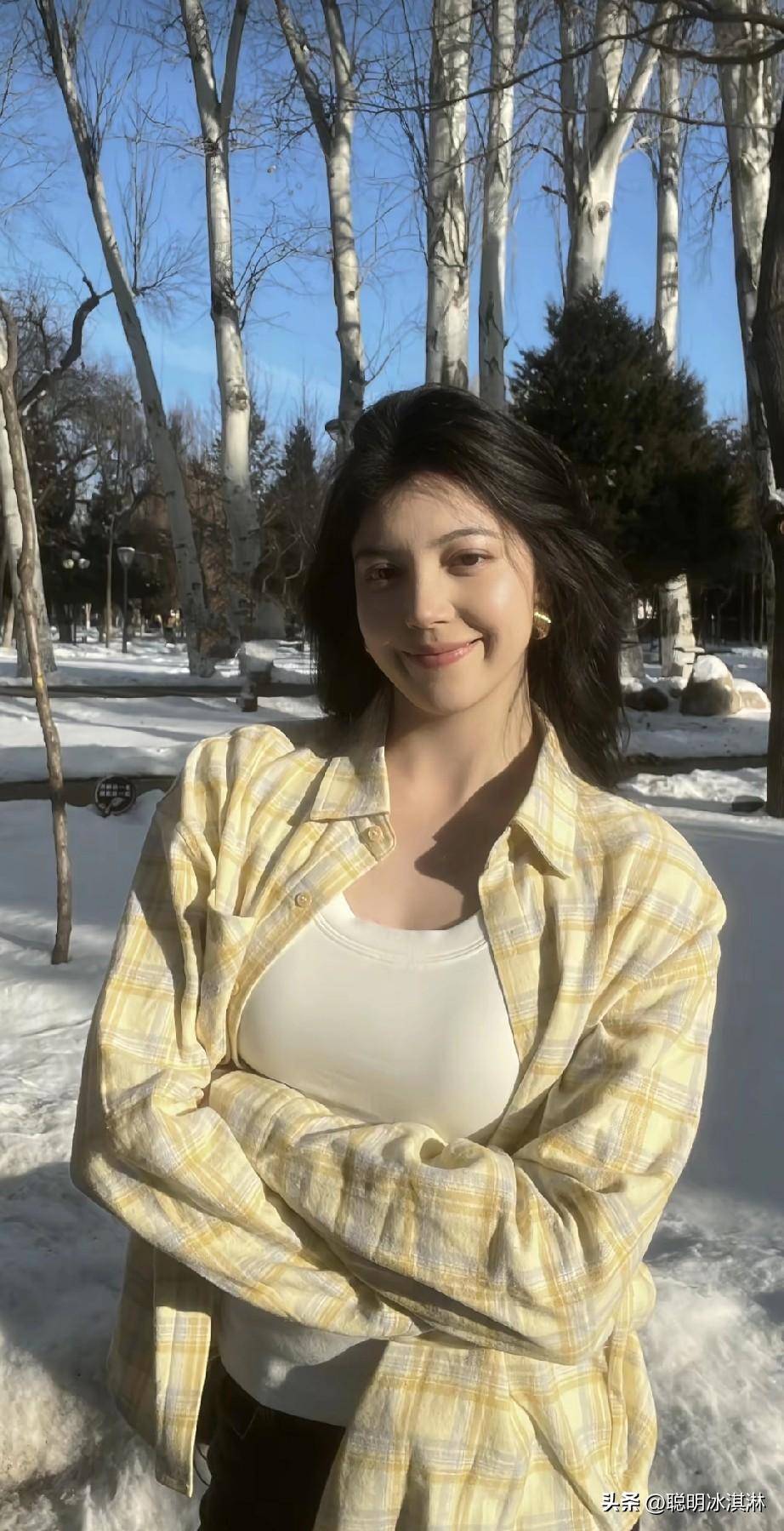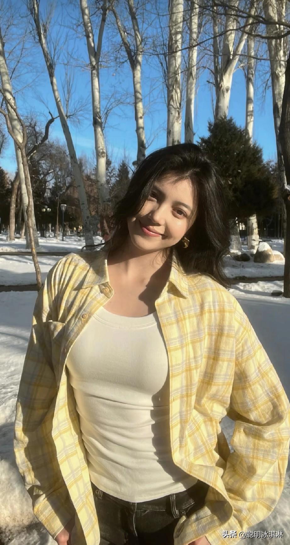 冬日暖阳下,甜美笑容绽放,黄格子外套与雪景相映成趣!