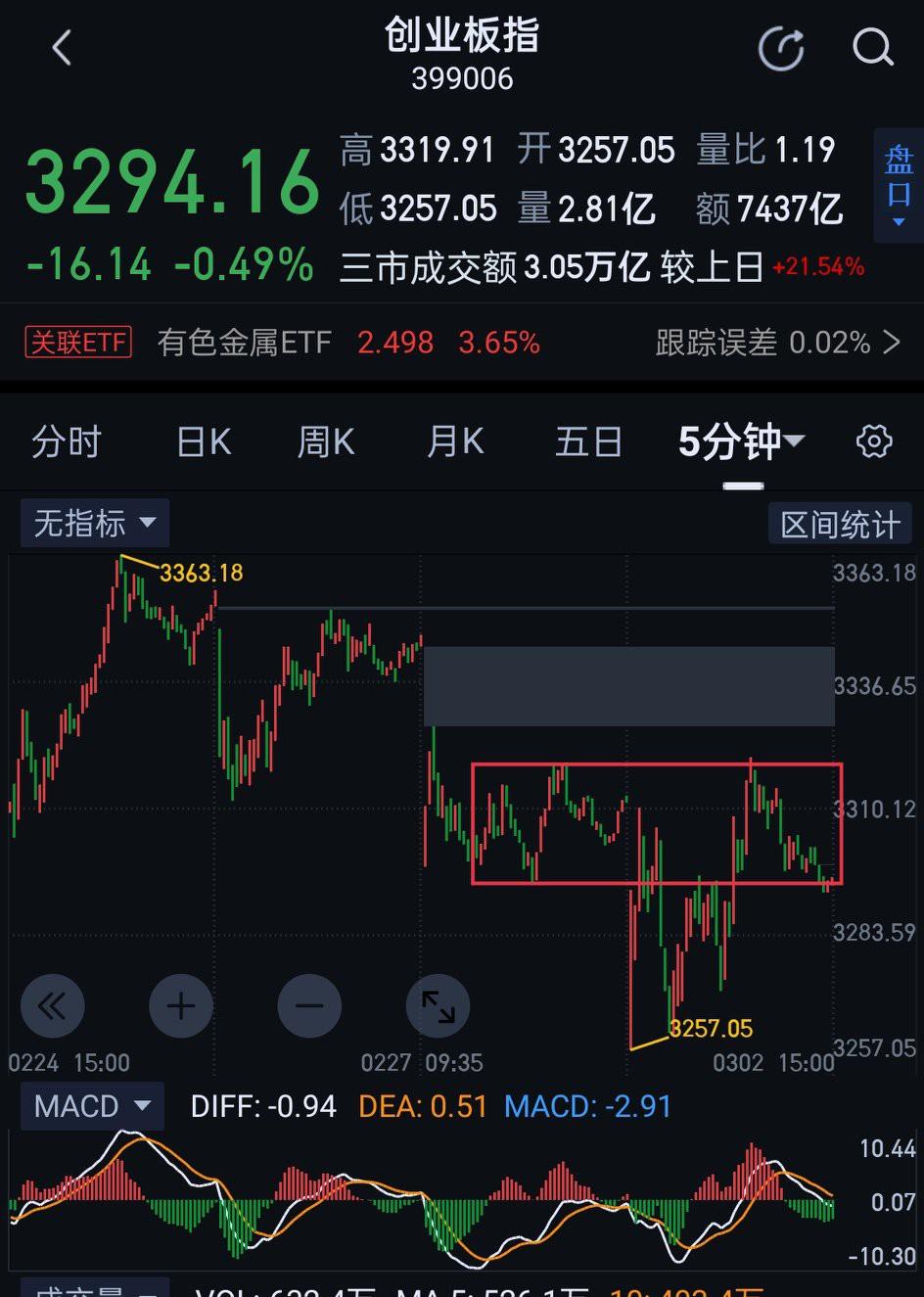 创业板,明天面临短期的方向选择。创业板目前的走势仍是围绕图〈1〉的五分钟中枢的震荡延续。结构上,在没有围绕该中枢形成三买或三卖前,创业板暂可用围绕该中枢震荡来观察。细节上,明天需观察围绕图〈2〉的一分钟中枢是否形成三买或三卖。如形成三买,可期待形成图〈1〉五分钟中枢的向上离开段。如三卖形成,则要防止形成对图〈1〉五分钟中枢的有效破坏。