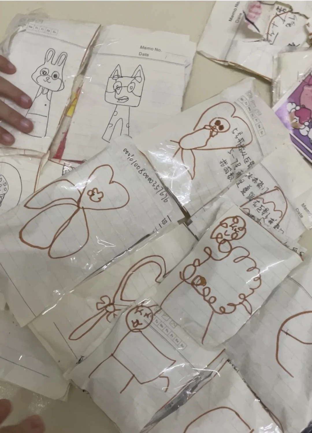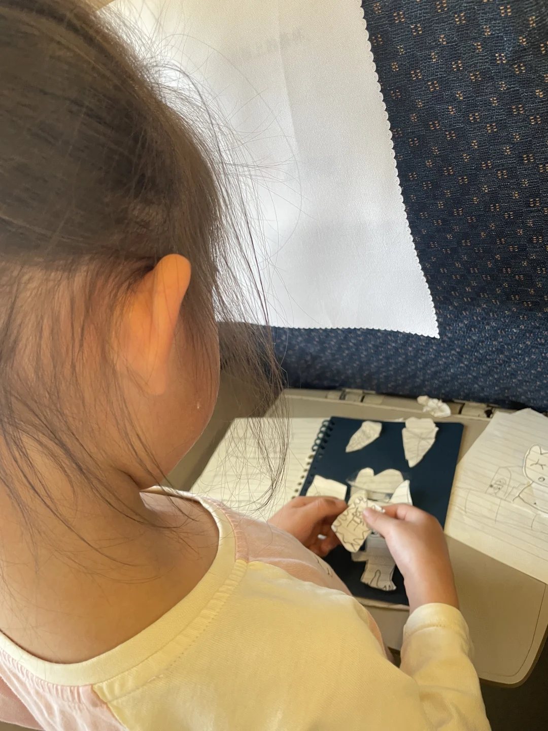 餐桌上铺满白纸,坐高铁时时折折贴贴,地铁上歇脚时安静地剪剪,睡觉床上摆弄自己做的盲袋,甚至在走路水时也要把贴纸书拿出来构思……