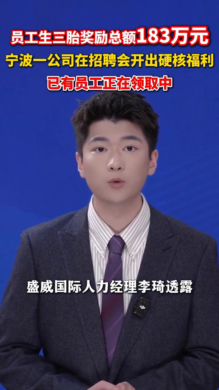 员工生三胎奖励总额183万元,宁波一公司在招聘会开出硬核福利,已有员工正在领取中。 实习主播孙嘉晟。 生三胎奖183万,宁波企业招聘推重磅福利,已有员工成功申领。在公司生三胎,我们就给183万总额的奖励,这个已经有员工拿到了。 在招聘会现场,盛威国际人力经理李琦透露,企业推出特色生育奖励,会在生育后逐年发放数万至十几万元,直至完全落实。这份福利既响应国家生育政策,保障女性职场地位,更是企业将员工当家人的暖心体现。 工作人员介绍,2025年集团主体产业数据实现11%的增长,员工工资福利稳中有进,人才需求比起常年只增不减。