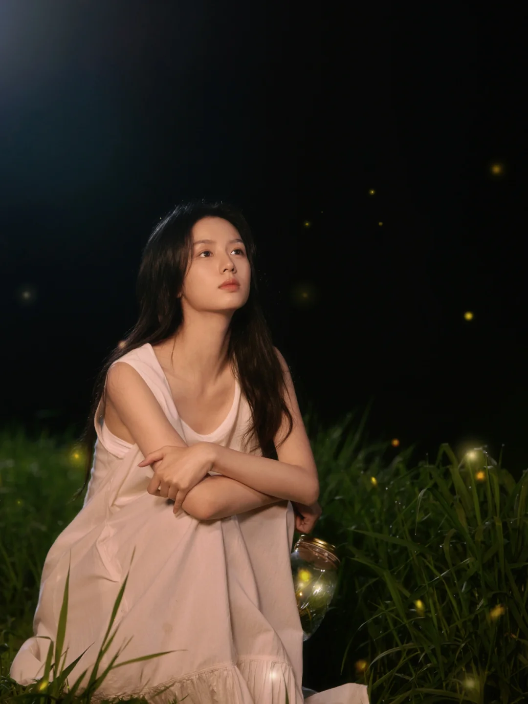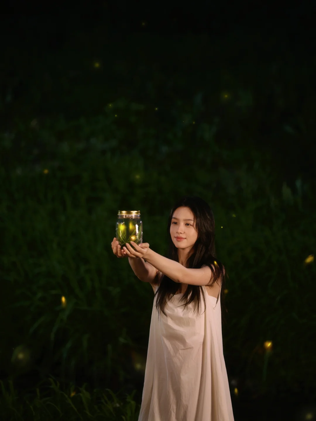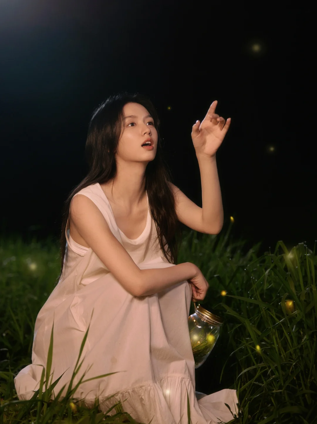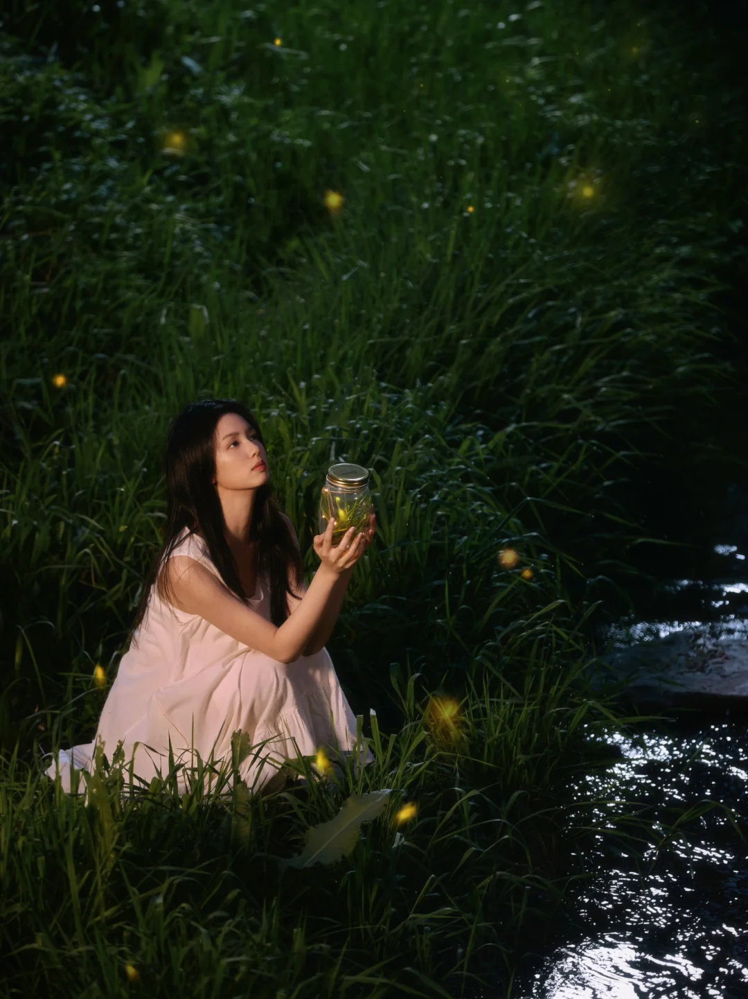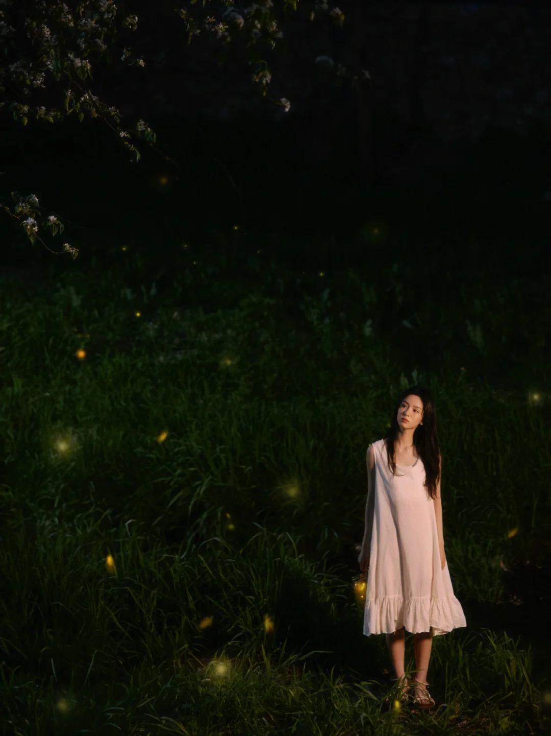 📷夏日写真参考 夏夜最灵动的瞬间,大概就是萤火虫点亮夜色的时候吧。最近看到周也拍的一组萤火虫写真,真的被美到了。她本身就带着一点清冷的气质,在夜色里显得更加高级。眼神里有着少女天真的憧憬,又有一种安静的故事感,像是夏夜限定的浪漫童话。 大家如果想仿拍同款写真也不难。可以找一处溪边作为拍摄地,夜晚拍摄记得先用补光灯照亮人物面部,后期用修图软件为照片添加萤火虫贴纸,也能实现这种童话般的意境。 摄影师:发发echo