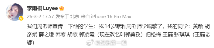 薛之谦李雨桐胡彦斌曾是同学薛之谦胡彦斌李雨桐曾是同学 此前,一个名为周筱燕的网友微博被扒出,2013年1月她曾晒出和学生的合照,薛之谦、李雨桐、胡彦斌均出现在照片中。据悉周筱燕是音乐老师,她当时配文是“今天召集我所有学生聚会”,薛之谦也有回复。3月2日,李雨桐也发博确认三人同学关系。