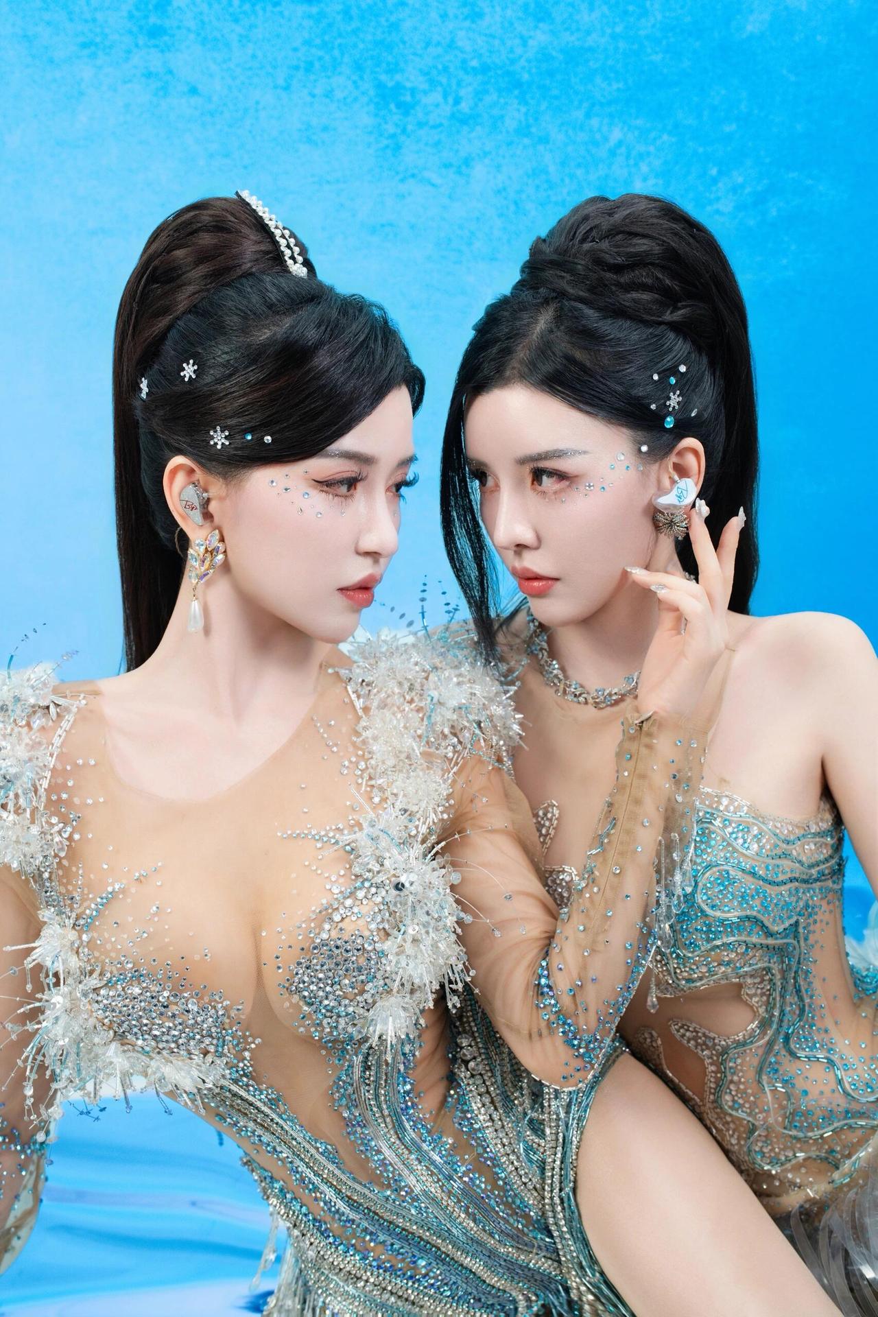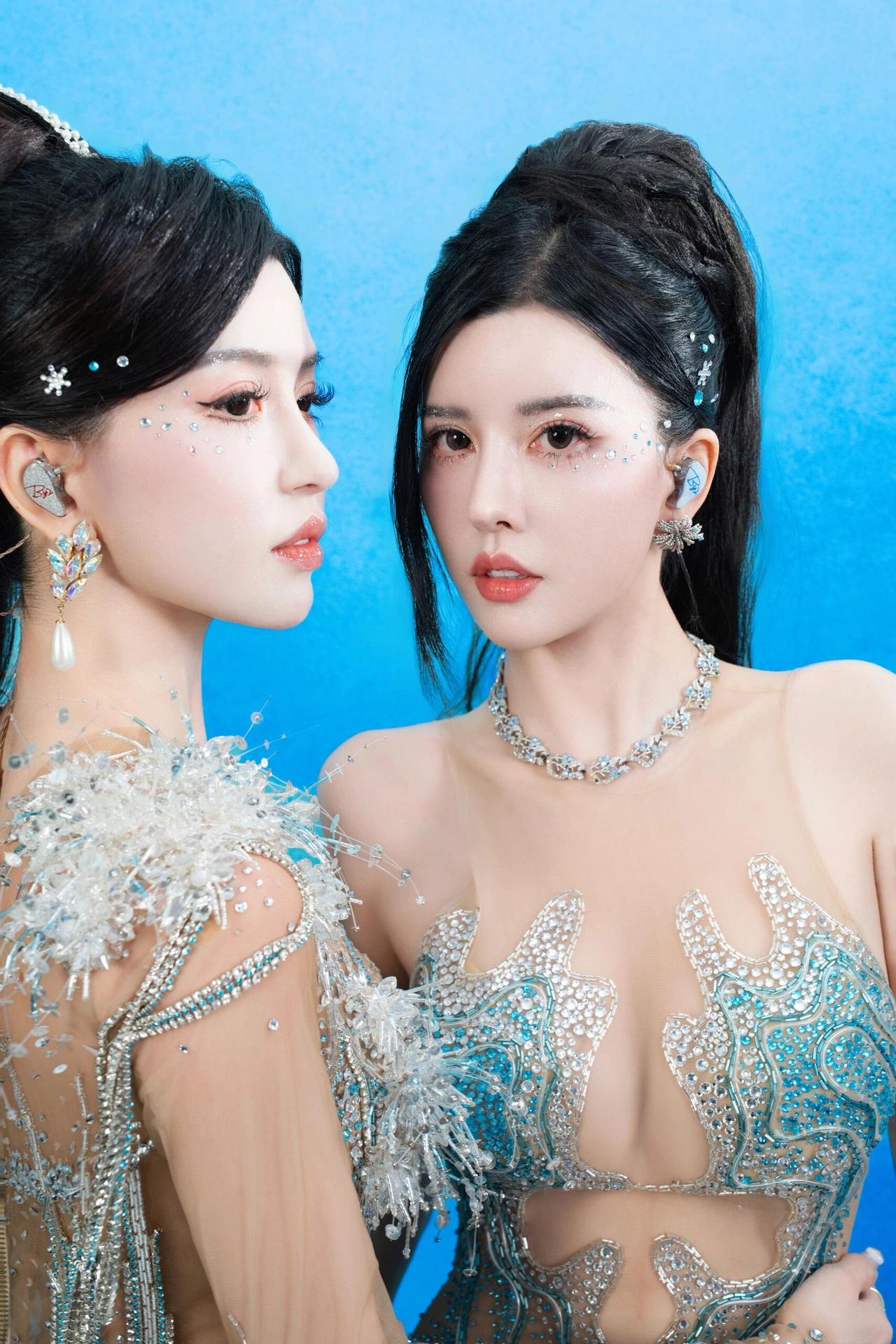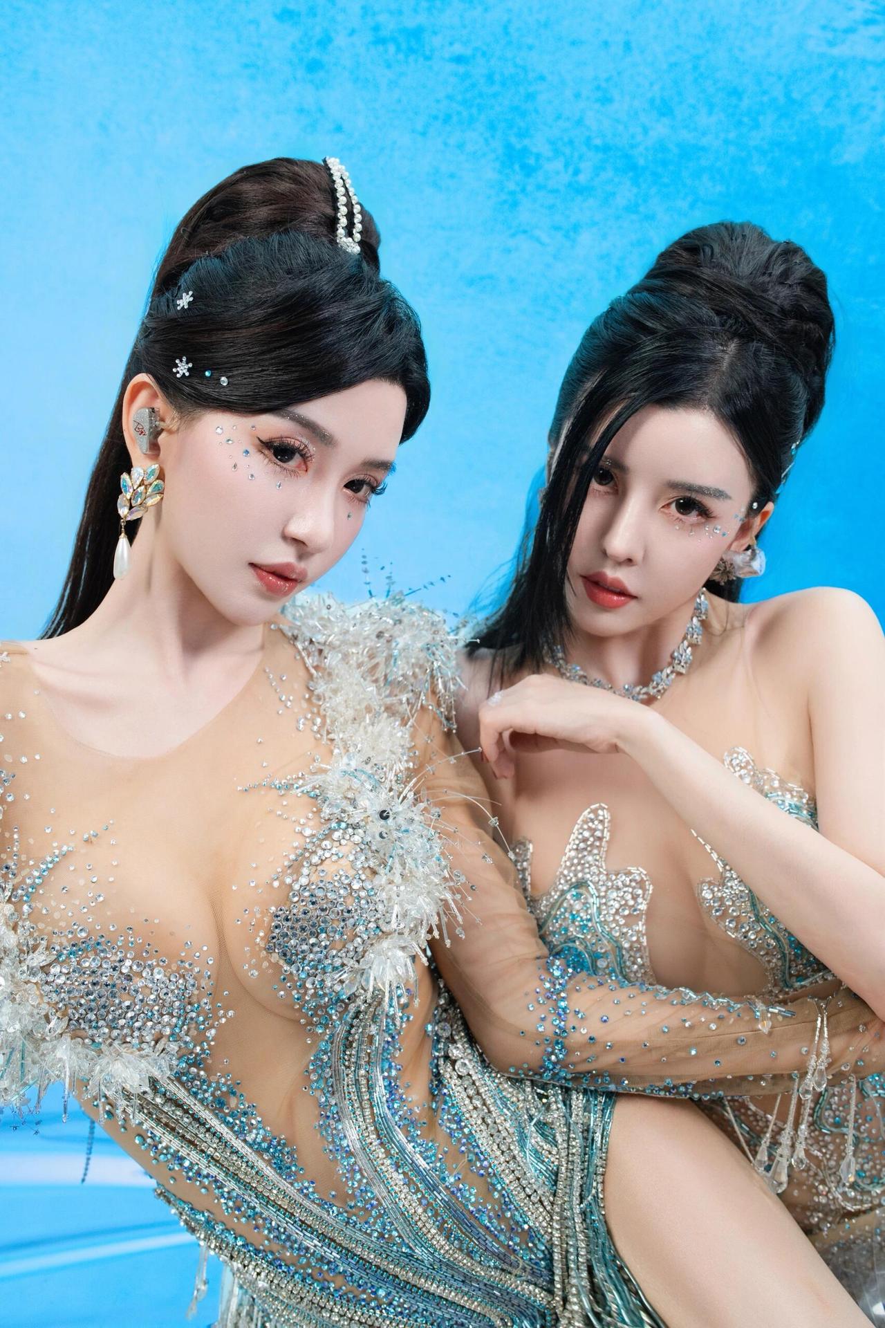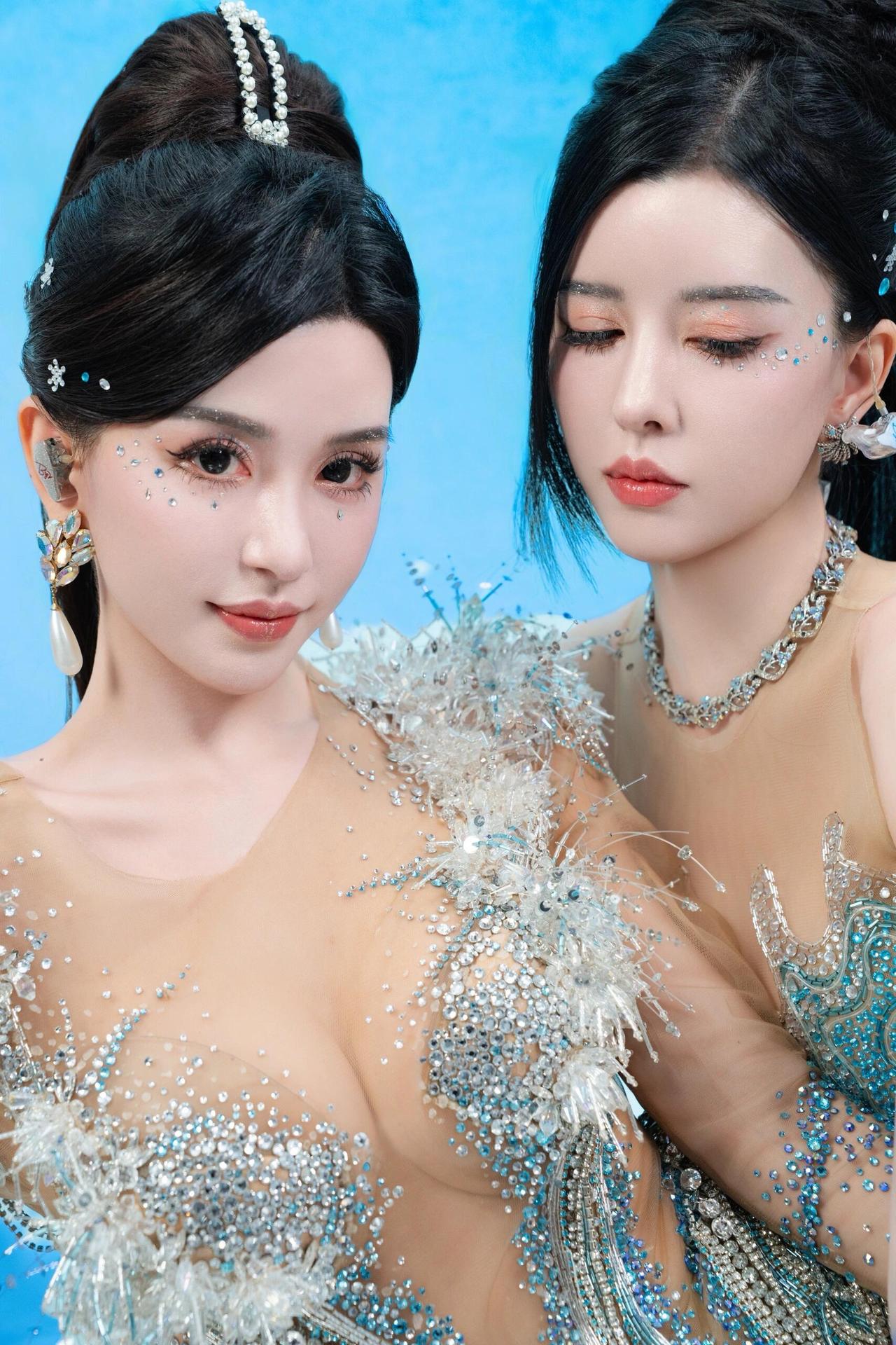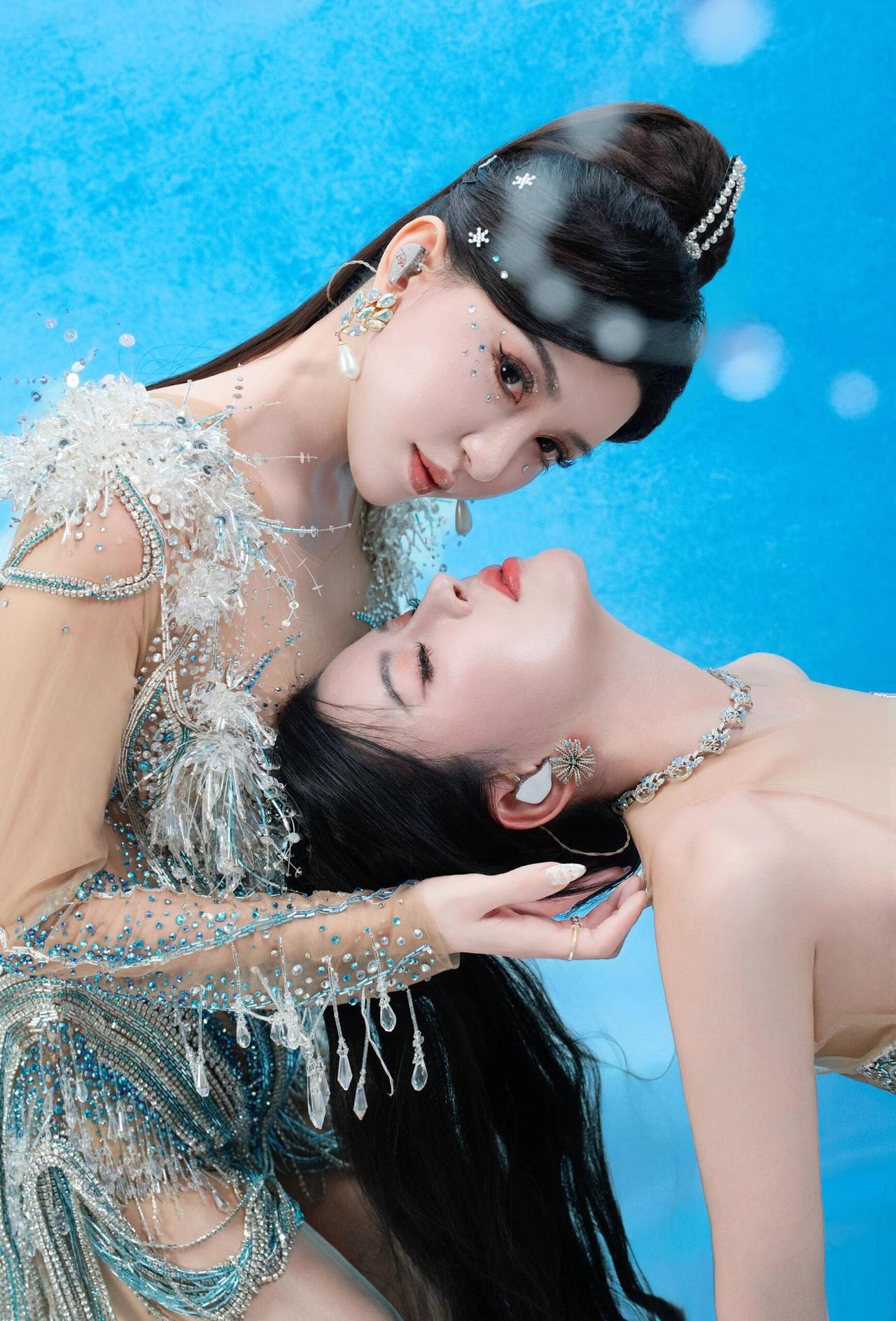 By2 冰蓝双生 她们是从深海里浮起的两尾鱼 鳞片缀满碎钻与星子 在透明的蓝里呼吸 发梢系着未融的雪 眼睫沾着潮声 每一次眨眼都抖落一片海 指尖相触时 有电流穿过水晶骨骼 像两束光在镜中重逢 世界被滤成纯粹的蓝 她们是彼此的倒影 也是唯一的岸